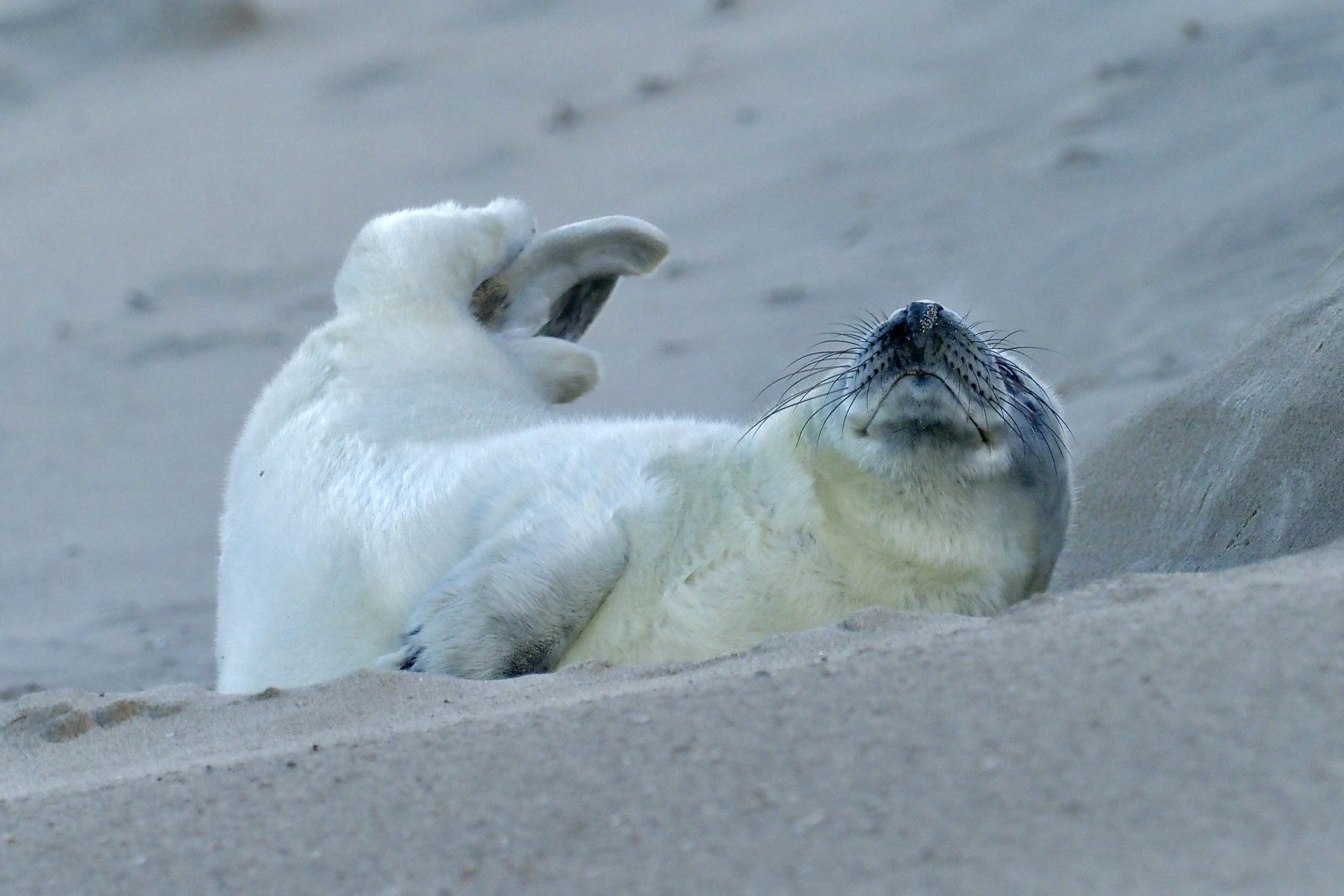Wel zien we de pup bewegen, rollen, de “banaan” houding aannemen. Deze laatste kenmerkende pose zal van groot belang zijn in zijn verdere leven. Rustend op de banken voor de kust (dagelijkse noodzaak om het zuurstoftekort in de spieren te neutraliseren) worden hoofd, flippers en staart zo door wind en zon gedroogd en opgewarmd. Op deze plekken van zijn lijf zit geen vetlaag en kan de lichaamstemperatuur het best gereguleerd worden.