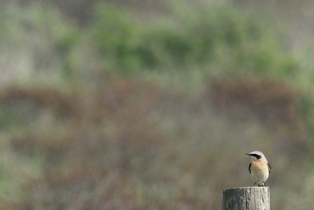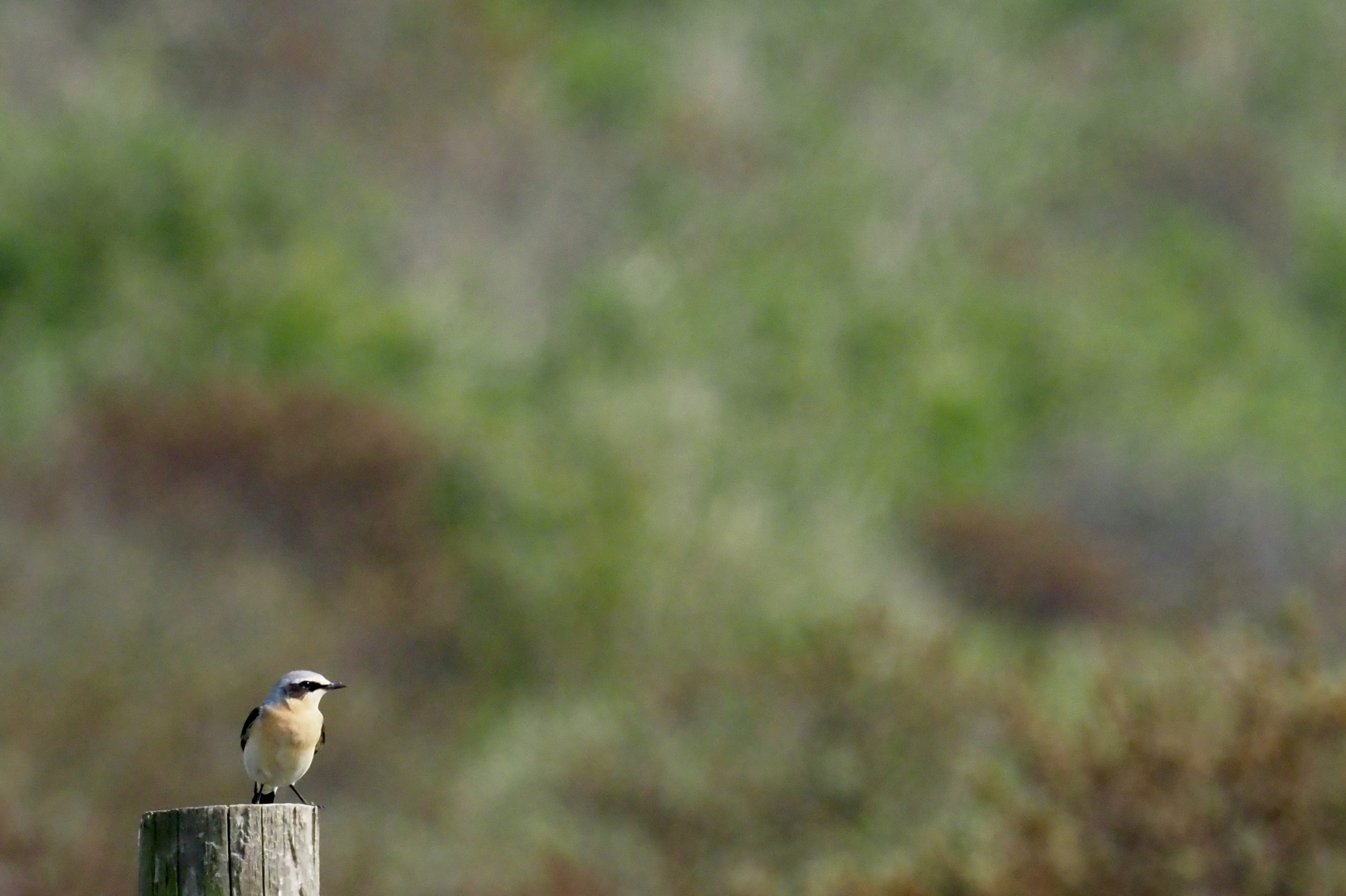Vandaag een poging om deze rubriek te vullen met lentekleuren gefotografeerd binnen 25 meter van de vloedlijn. Het strand lijkt zich te onttrekken aan de heldere voorjaarskleuren en zich te beperken tot het uitgebleekte groen, blauw en grijs maar niets is minder waar. Op zoek naar nestelende strandplevieren stuitte ik op dit mannetje tapuit in prachtkleed tegen de achtergrond van het frisgroene duinstruweel. Voor mij uit vliegend van paal tot paal en steeds te ver om hem lekker op de plaat te krijgen. Er zijn makkere vogeltjes, dekking was niet te vinden en blijkbaar was 30 meter de marge die het diertje hanteerde. Uiteindelijk gelukt om twee acceptabele opnamen “en profil” te maken. Toen was het feest over. Het nog schuwere vrouwtje, wel waargenomen, liet zich niet vastleggen.