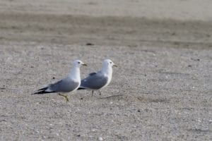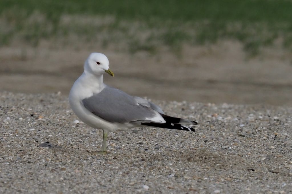 Tegen de avond, op de weg terug van een lange vergeefse zoektocht naar strandplevieren bij de Groene Punt kwam ik op het oude Autostrand deze meeuwen tegen. Te gewoon om de verrekijker op te richten liet ik ze voor wat het was: een koppeltje zilvermeeuwen. De gracieuze vorm en het vriendelijke hoofd maakten me aan het twijfelen: het bleek om stormmeeuwen te gaan. In de winter een zeer algemene vogel, bekend van het strand maar ook van het akkerland ( achter de ploegende boer). In de zomer broedend aan de kust met een bescheiden aantal van 3500 paren, voornamelijk in Noord-Nederland.