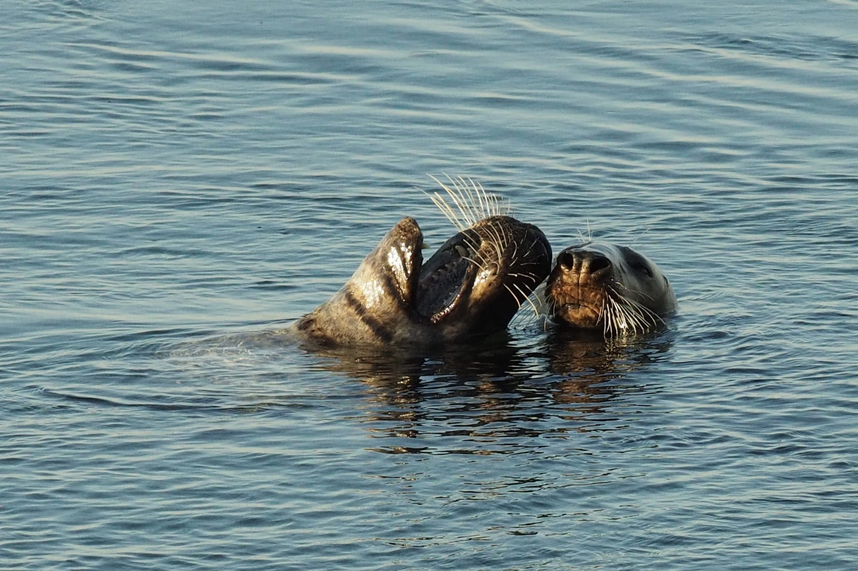 Vanmiddag bij de spuisluis op de Brouwersdam deze twee knuffelende kegelrobben. Ogenschijnlijk in een tevreden bui. De bul had zojuist een platvis opgepeuzeld die in de vitrine bij de visboer niet zou misstaan, was helaas net te laat om dat vast te leggen. Op deze foto wel goed het gebit te zien van de kegelrob, de tanden staan verder uit elkaar dan bij de gewonde zeehond. Maakt het gebit nog effectiever bij grotere prooien.  De neusgaten staan bij de kegelrob verder uit elkaar dan bij de gewonde zeehond hetgeen bij het vrouwtje hier duidelijk te zien is.