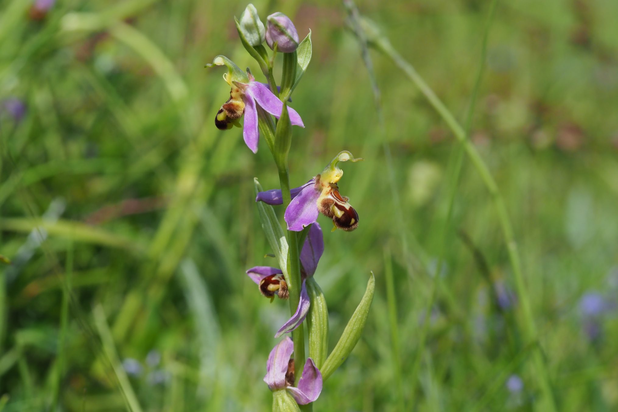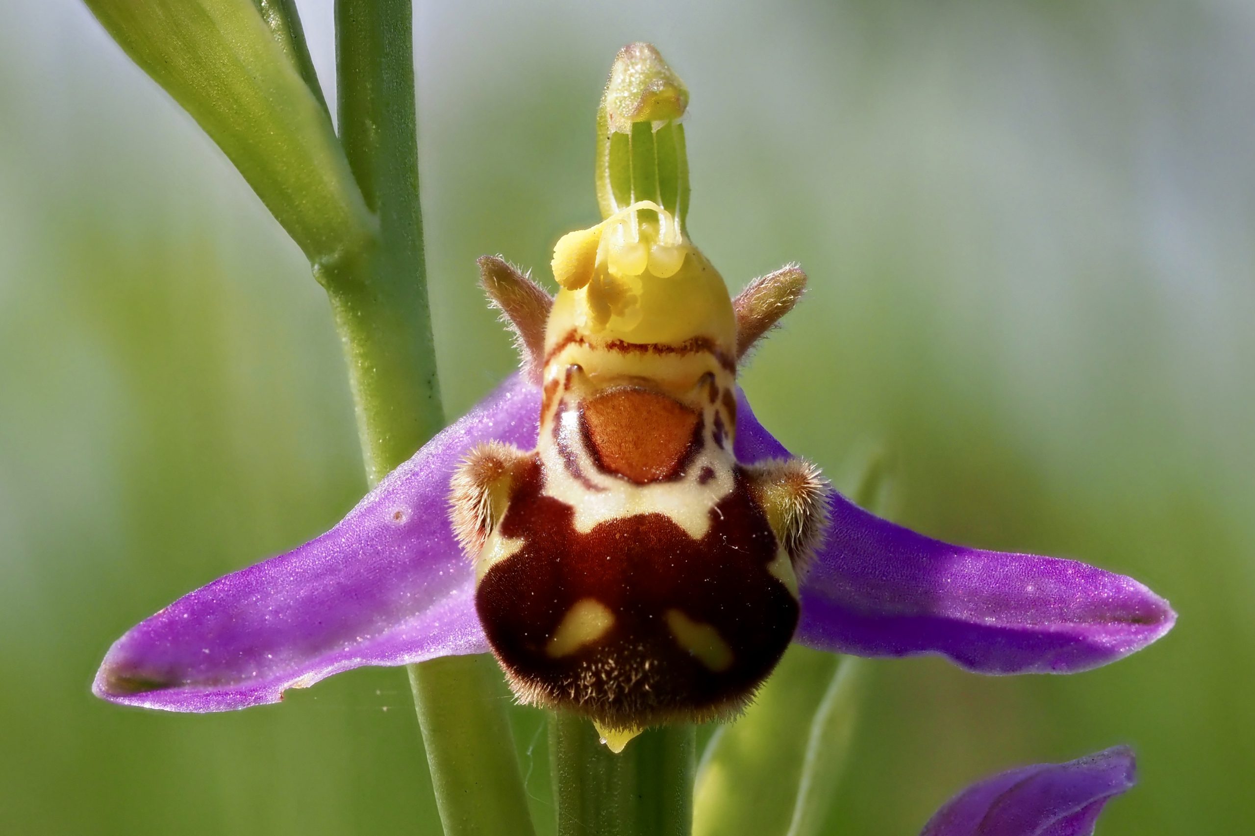 Het pad naar het strand voerde vanmorgen over de natte duinvallei, bekend om zijn vele bloeiende planten waaronder tal van orchideeën. Tussen de hoeveelheid kleuren zoals groen, geel, roze paars, blauw stond een groepje bijenorchissen. Een in het westen en zuiden algemeen voorkomende orchideeensoort die zijn naam ontleent aan het uiterlijk van de bloem: alsof er zojuist een bij op is geland. Een gratis schoonheid op mijn pad en nog in grote getale ook. Dat laatste maakte niet het effect maar juist het isoleren van de bloem, zoals op deze foto. De rest van de tocht werd bijzaak.