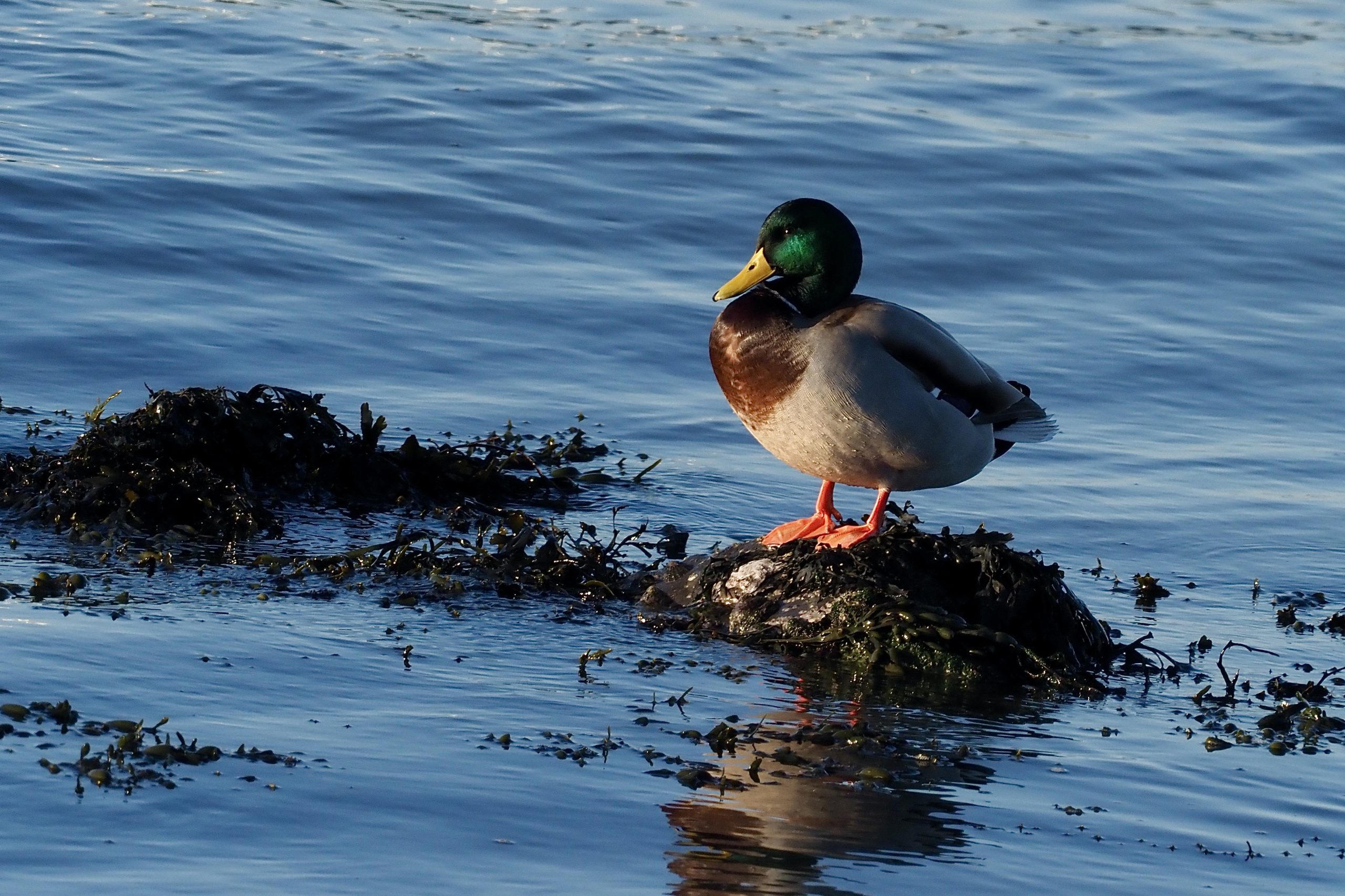 Maar als je dan met vriesweer langs de kust loopt en boven het ijsblauwe water deze wilde eend ziet in de najaarszon dan kan je niet anders dan dat beeld vastleggen. De metaalgroene kleur van de kop, de oranje poten, de okergele snavel met de bruingetinte romp: een kleurenpatroon dat bij een tropische vogel niet zou misstaan. Dus gewoon er vandaag een plaats voor ingeruimd op deze site!