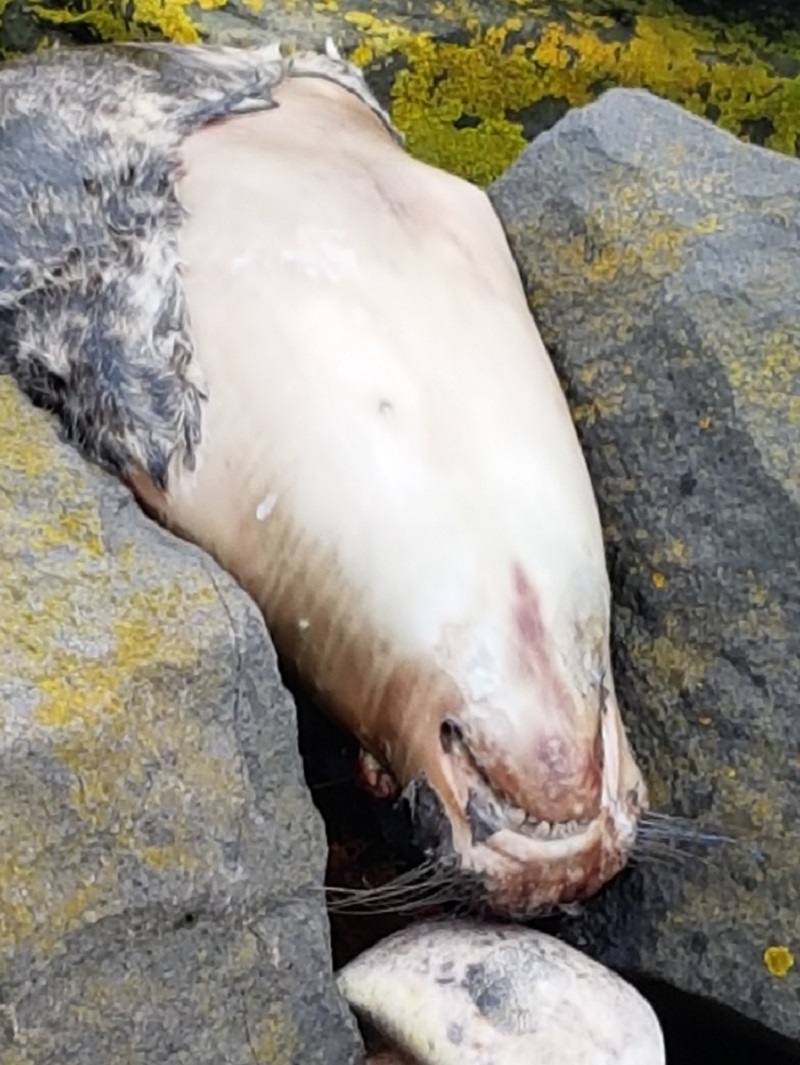Op de stenen van de strekdam bij de buitenhaven zou een dode zeehond liggen.