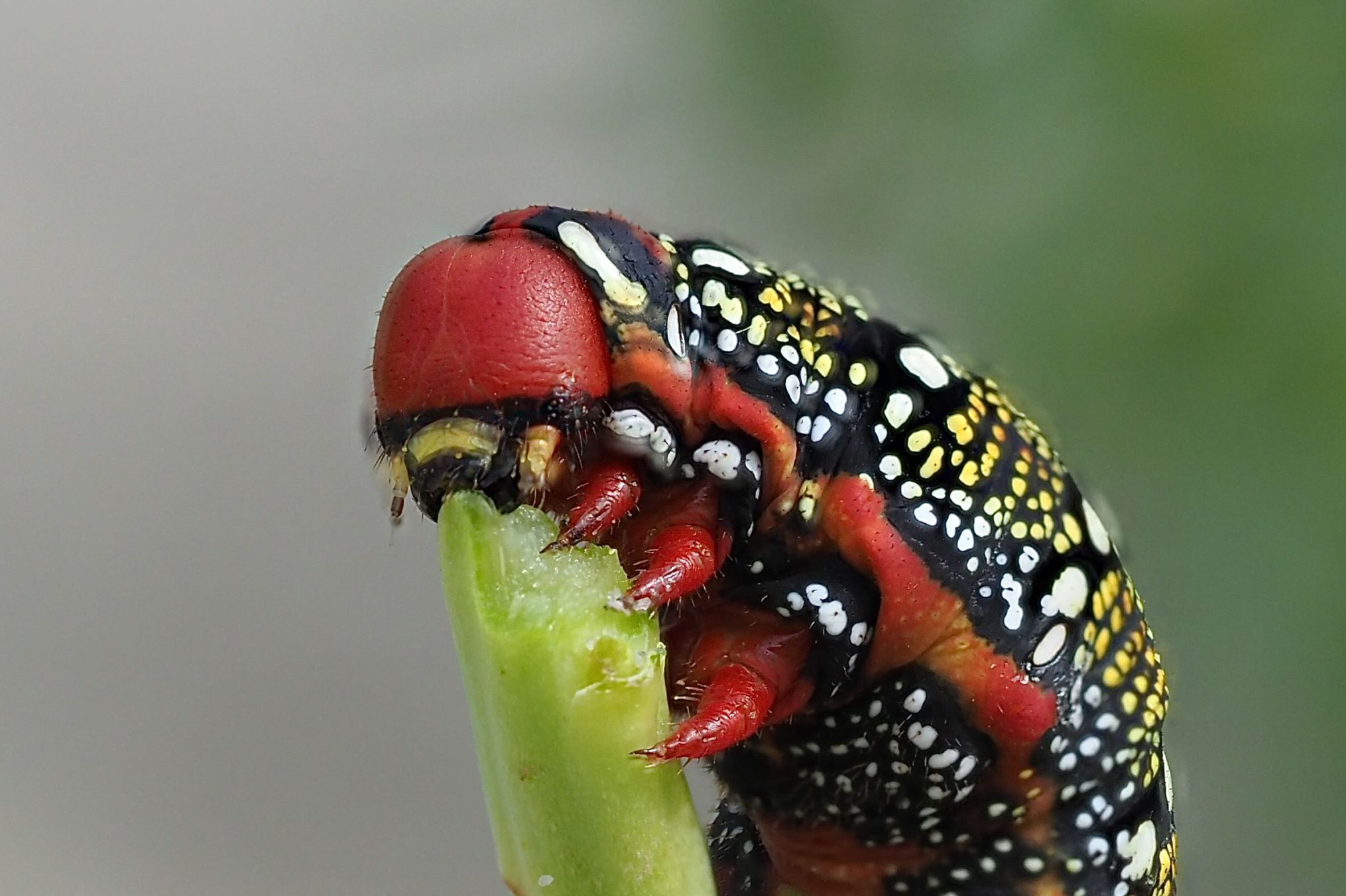 Mooie tendentieuze berichtgeving. Wanneer we het beeld uitzoomen wordt duidelijk waar het om gaat. Het betreft de Wolfsmelkpijlstaartrups die zojuist op de kaalgevreten stengel van de Zeewolfsmelk zich ontlast heeft. Een ware evenwichtskunstenaar die al etend weet te poepen en met zo’n precisie dat de geproduceerde drol keurig blijft liggen. Voor de lezers die niet bekend zijn met deze wonderschone rups: de pijlstaart zit zoals de naam al aangeeft aan de achterzijde.