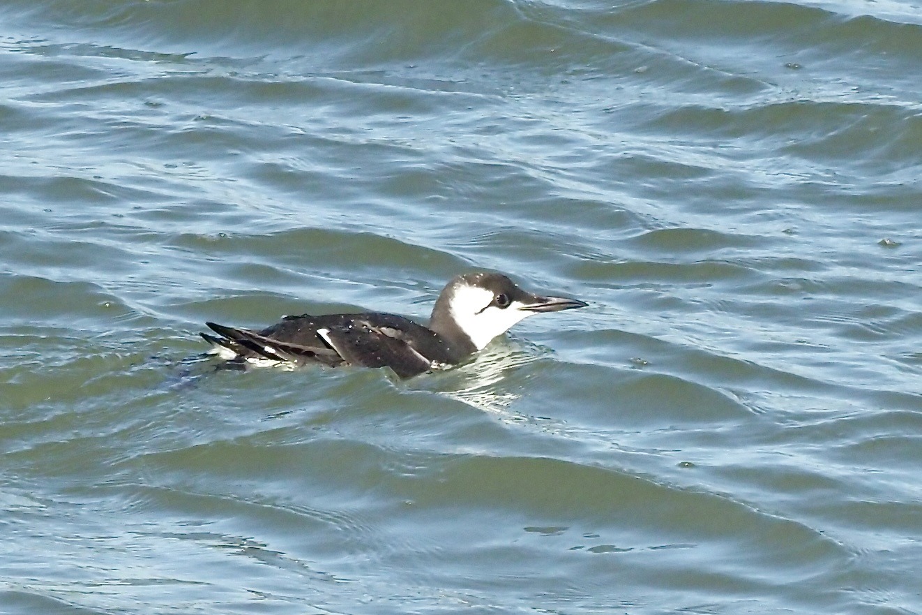 En hoewel beide vogels levend niet zo makkelijk te zien zijn hier aan de kust, dook vandaag onverwachts in de zoeker van de camera deze levende Zeekoet op. Hij dook onder en liet zich daarna niet meer zien. Bleef vermoedelijk aan het zicht onttrokken door de steile oeververdediging. Slechts 1 opname van matige kwaliteit maar de koet was duidelijk gestuurd om ons pad te kruisen, dus wie zijn wij om de opname niet te gebruiken.