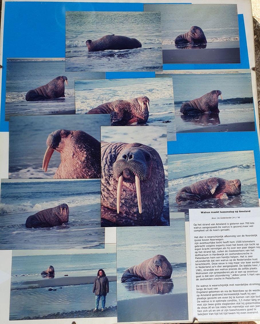 Eenmaal in ons gezellige huisje op het terrein van Josee en Peter, jutters op Ameland, lieten ze ons enkele foto’s zien van hun ontmoeting met een walrus op het strand, enige, jaren geleden.