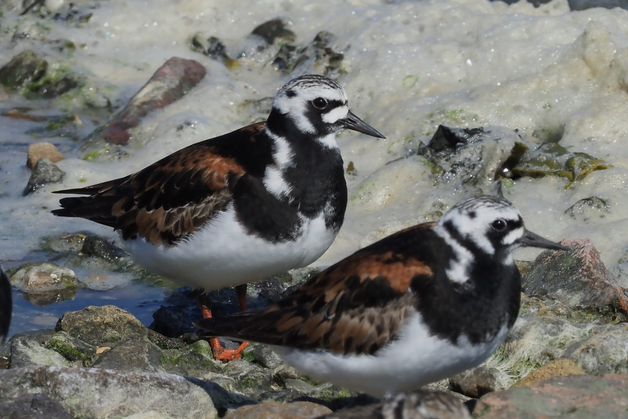 Een groepje steenlopers was aan het voedsel zoeken op de basaltblokken aan de rand van het wad. Door het hoge water naar de kant verdreven kwamen ze makkelijk in het vizier. Hoewel, ondanks hun opvallende zomerkleed waren ze moeilijk te onderscheiden tegen de met pokken en resten wier in verschillende kleuren beklede ondergrond. Het fraaie opvallende veren kleed bleek een geraffineerde dekmantel te vormen.