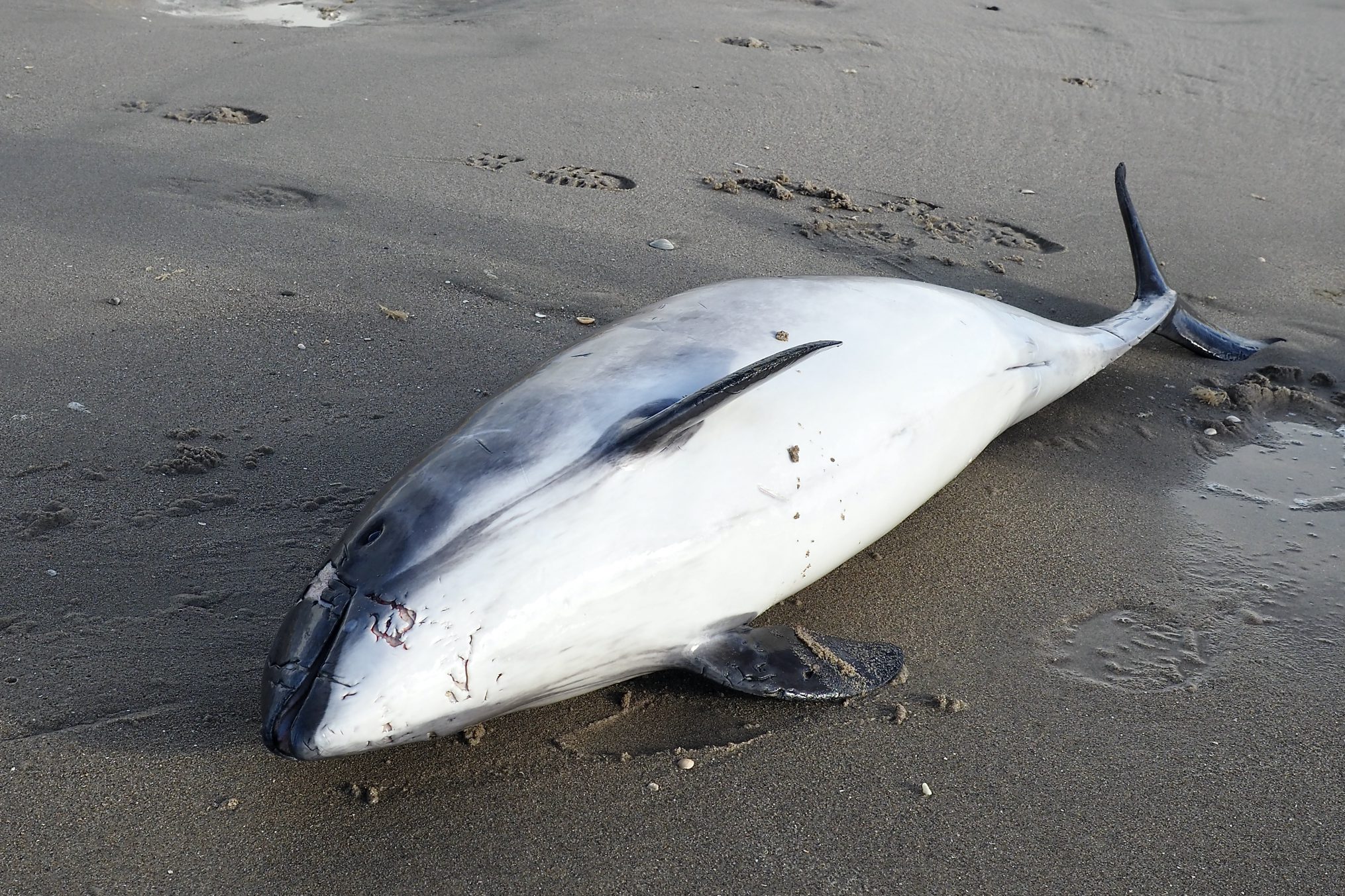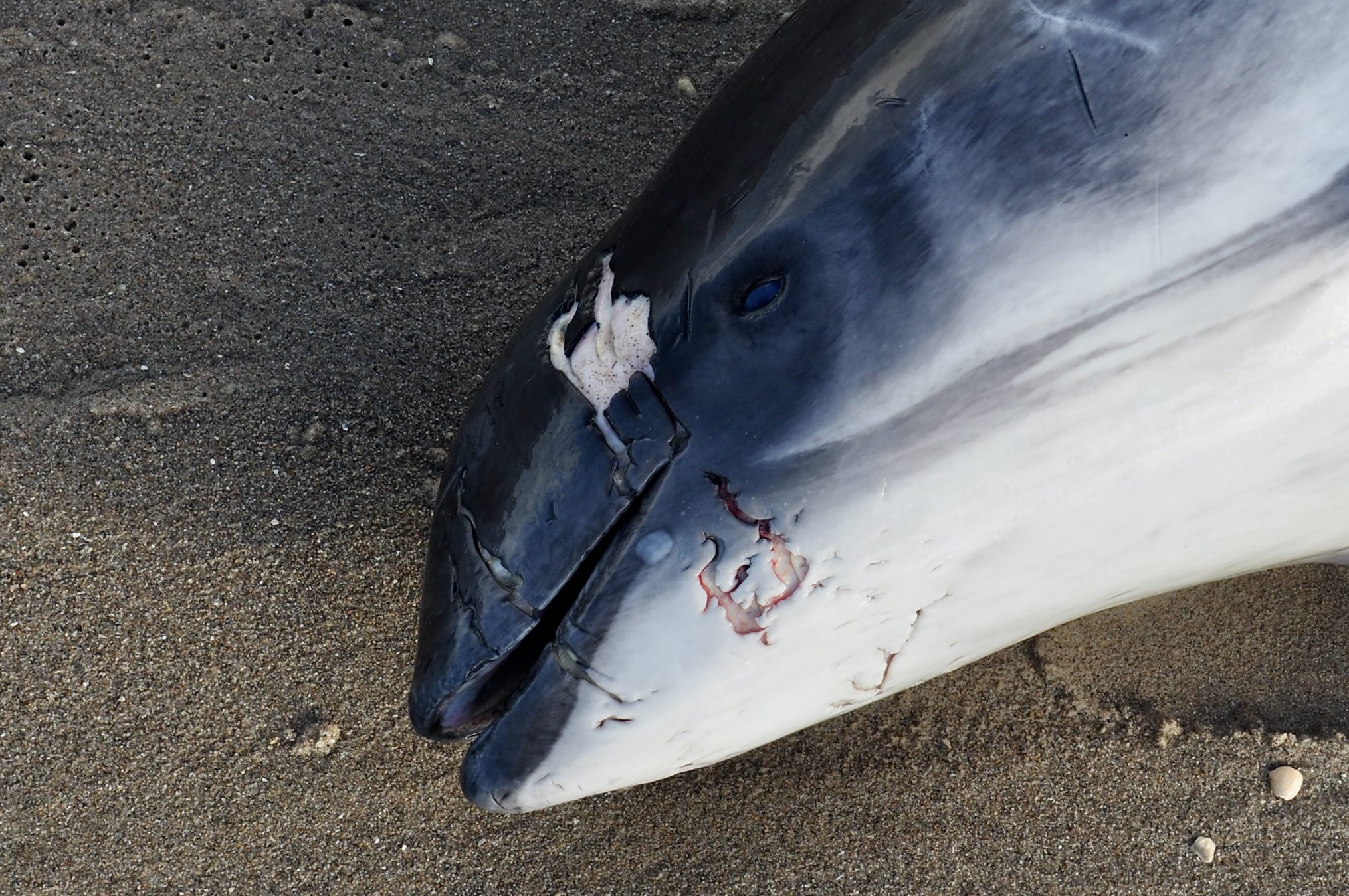 Uitgerukt naar de Maasvlakte zagen we het dier in de branding liggen, ogenschijnlijk levend. Maar het was de zee die beweging gaf aan het nog verse kadaver. Van dichtbij waren de sporen van een niet natuurlijke doodsoorzaak te zien.