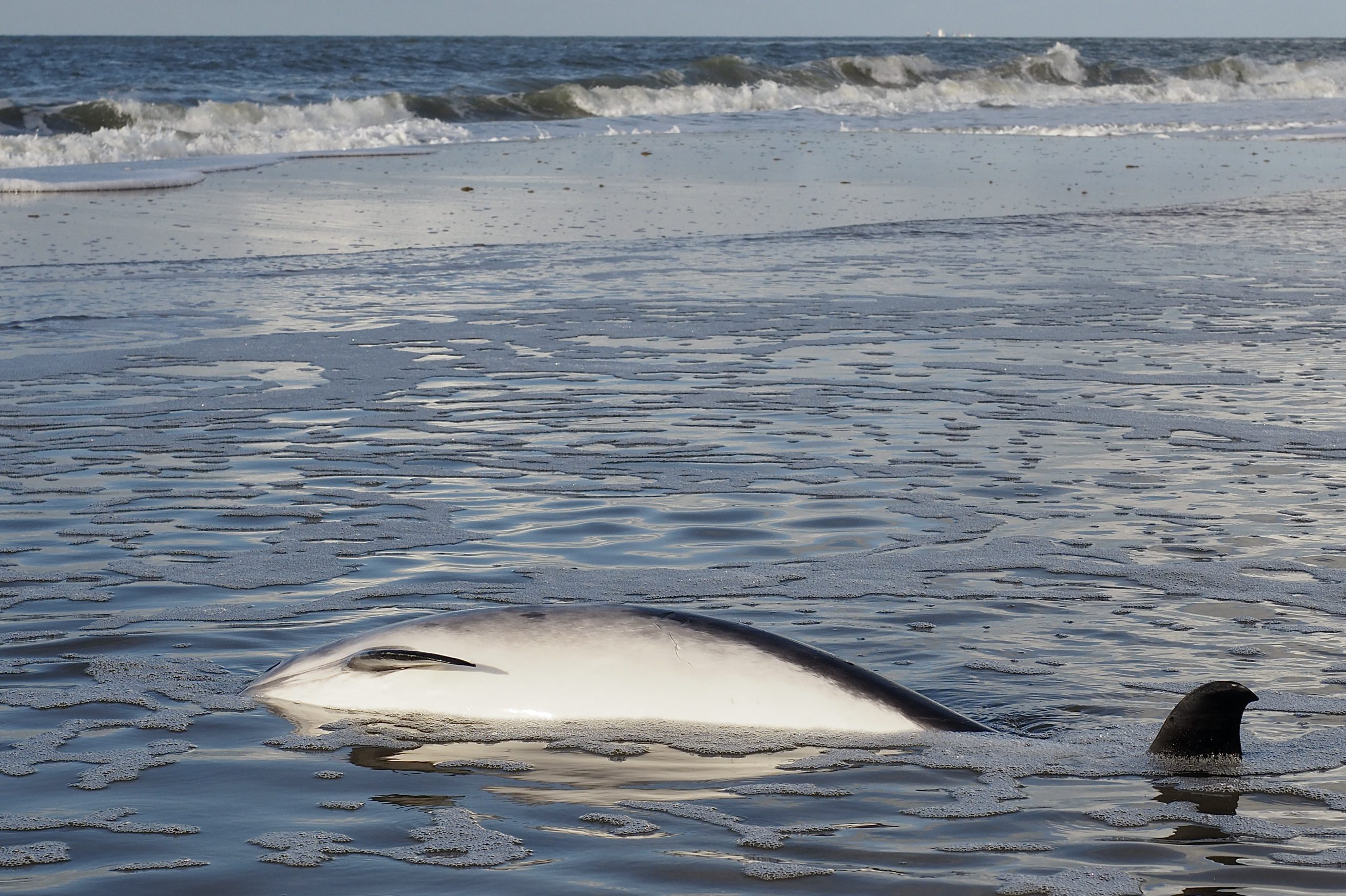 Uitgerukt naar de Maasvlakte zagen we het dier in de branding liggen, ogenschijnlijk levend. Maar het was de zee die beweging gaf aan het nog verse kadaver. Van dichtbij waren de sporen van een niet natuurlijke doodsoorzaak te zien.