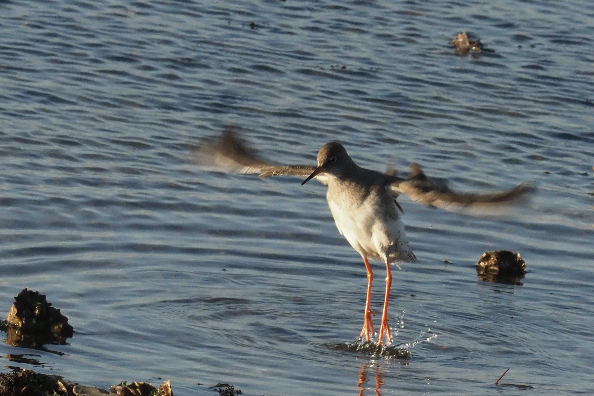 De lange poten van deze tureluur komen geheel uit het water. De vogel had zichzelf een grondige poetsbeurt gegeven. Het minuten durende tafereel werd afgesloten met het droog wapperen van de vleugels. Dit gebeurde met zo’n kracht dat de zwaartekracht werd overwonnen en het beestje loodrecht opsteeg. Verbaasd werd het wapperen abrupt gestaakt en viel de tureluur weer in het water.