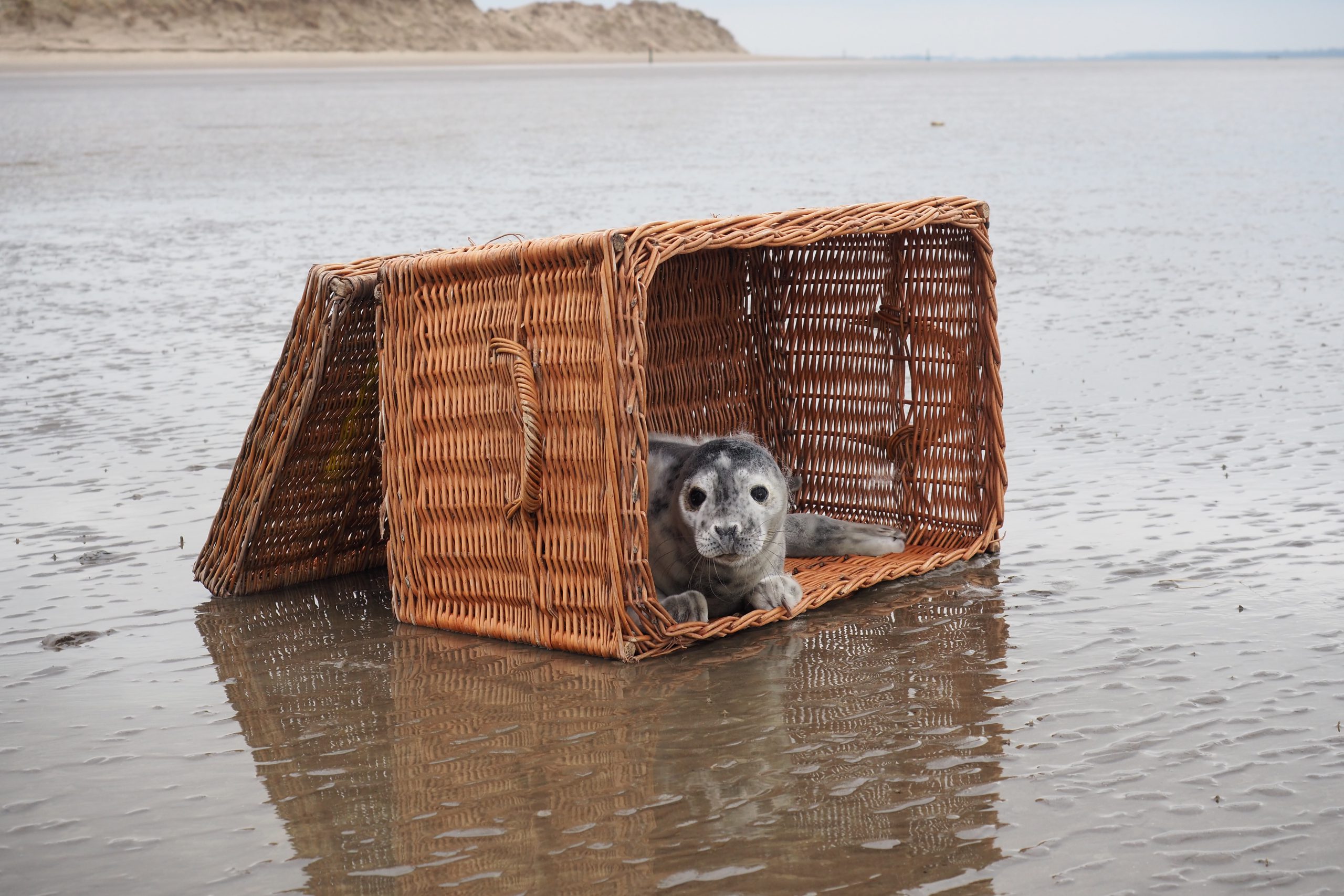 Een jonge zeehond die was aangetroffen op een druk strand wordt elders op een rustig deel van de kust weer vrijgelaten. De ca 4 weken oude pup was in goede conditie en moest op eigen kracht zijn weg kunnen vinden. Enigszins beduusd keek hij zijn vrijheid tegemoet om vervolgens schoorvoetend de mand te verlaten.