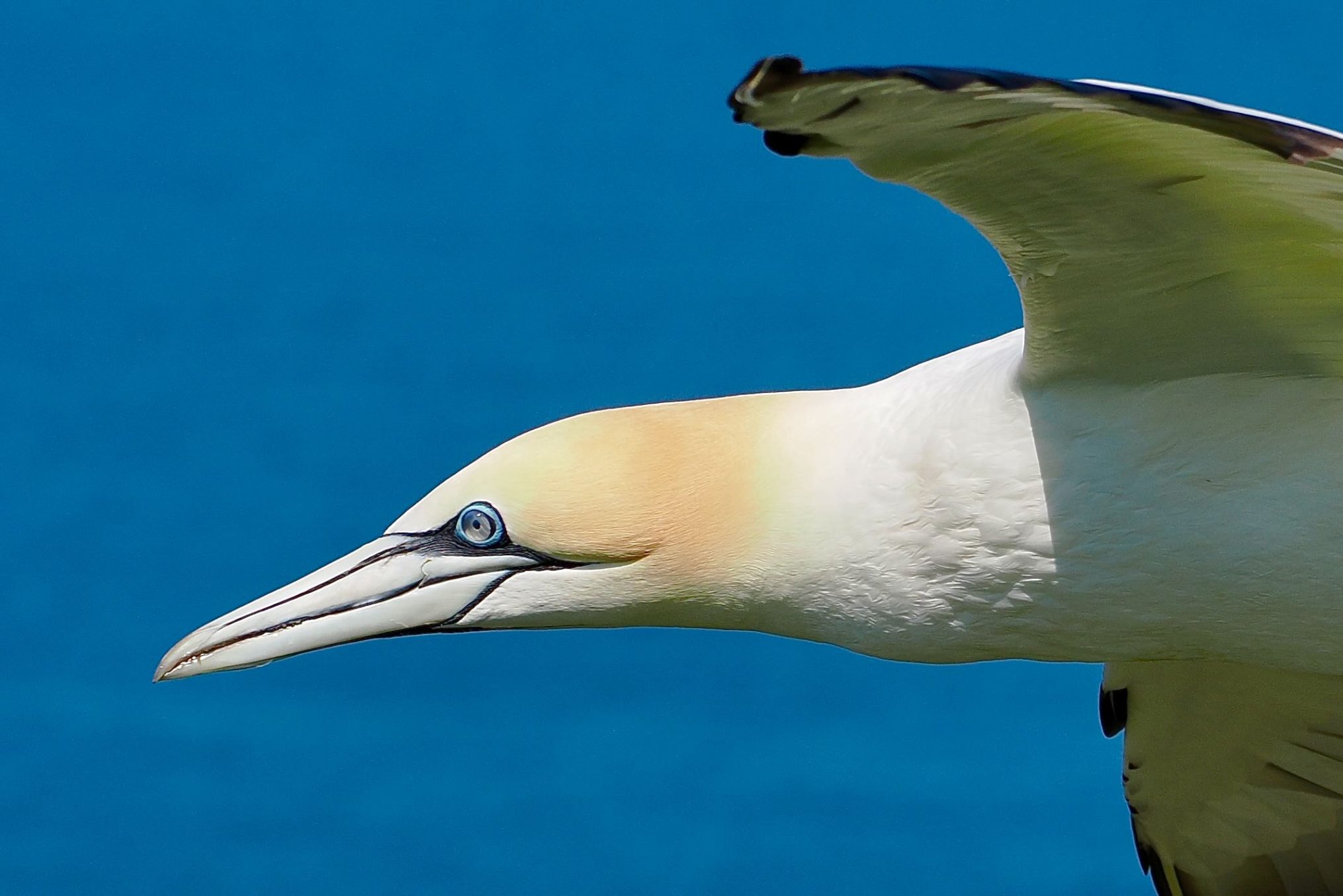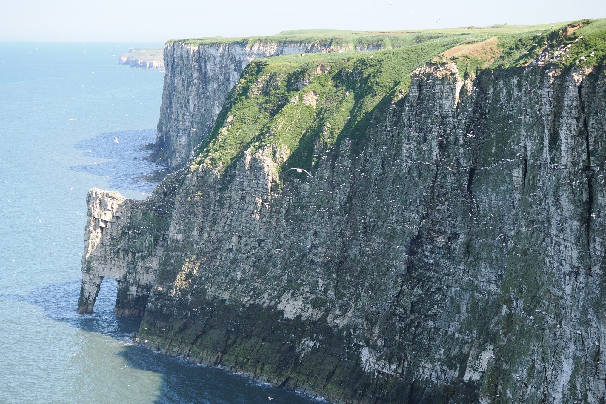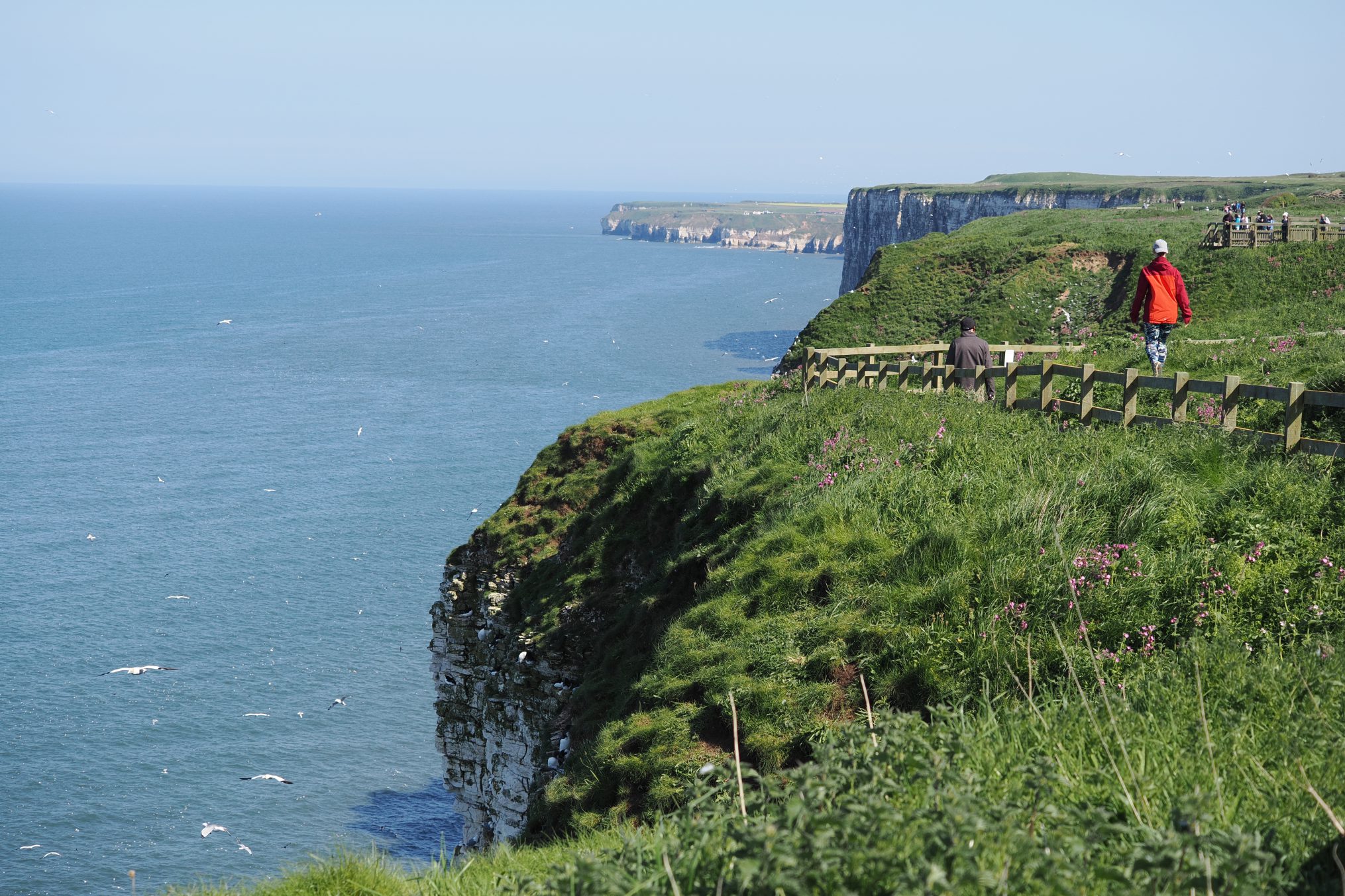 Het aardige van Bempton Cliffs is dat je op gelijke hoogte staat met de vliegende Jan-van-genten. Naar schatting zo’n honderd meter boven de zee loopt een wandelpad met een houten hek. Daarachter de vrijwel loodrechte rotswand die boven de zee uittorent. Juist daar is het domein van duizenden Jan-van-genten. Gezeten op de richels richten ze hun nesten in voor het naderende broedseizoen.