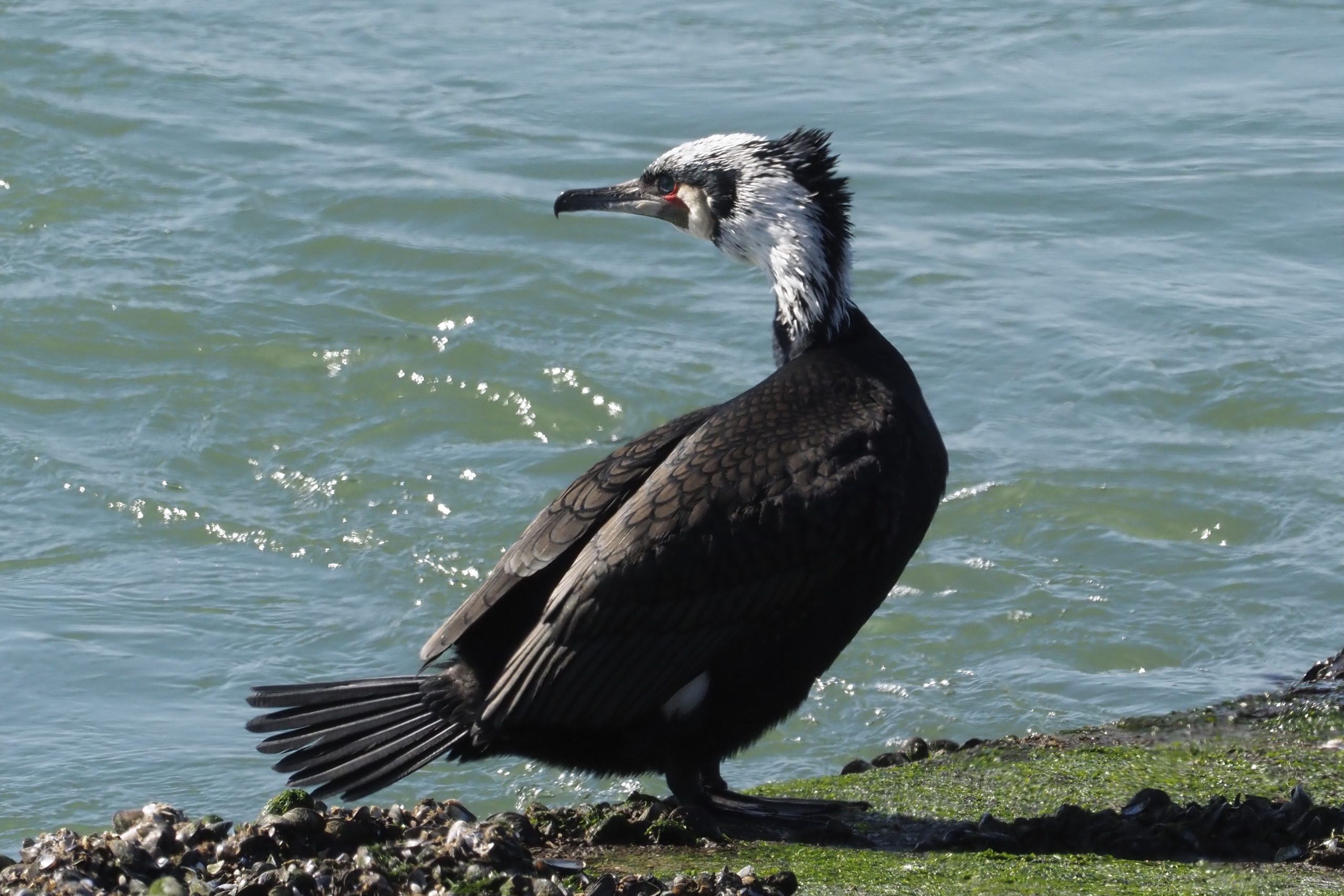 Aalscholver in prachtkleed. Op z’n paasbest zou je kunnen zeggen. Het wit neemt de overhand op de kop. In juni van dit jaar zal het alweer sterk verminderen en zullen nog maar wat witte plukken over zijn. Maar voor nu is het genieten van deze bij veel mensen niet bewust bekende tooi. Als je een aalscholver ziet neem even de moeite om er naar te kijken. Extra tip: in de vlucht zie je nu ook mooi dat witte vlak aan de flank net boven zijn poten. Echt, je hoeft niet naar de Galapagos of op safari in Afrika……. gewoon Maasvlakte