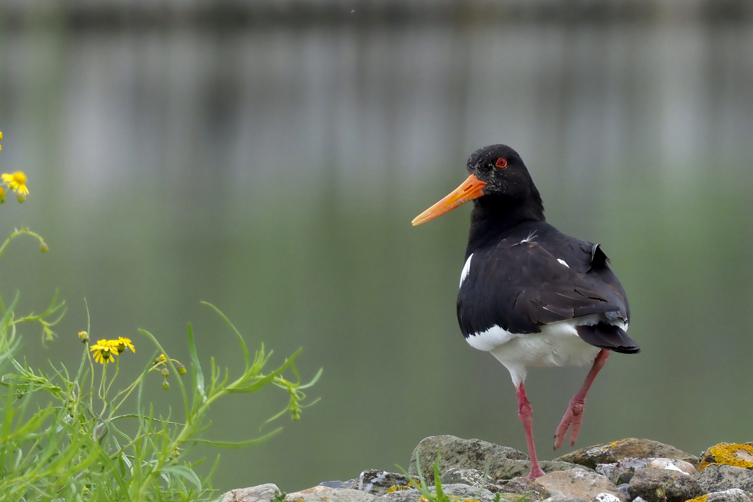 Nu zal U het inmiddels wel duidelijk zijn dat ik een fan ben van deze vogel, schitterende stoffering van het landschap. Kust, strand en de weiden. Zijn kleurenpatroon doet het altijd goed. Karakteristieke vorm en een frisse verschijning. Zwart, wit, oranje, en twee soorten rood. En toch zit daar iets vreemds in. Over het algemeen combineert de kleur rood niet met knaloranje, laat staan twee verschillende kleuren rood. Het rauwe rood van de poten, het midden rood van de iris gecombineerd met die snavel. Heel apart en toch bekoort het. Natuur blijft verbazen.