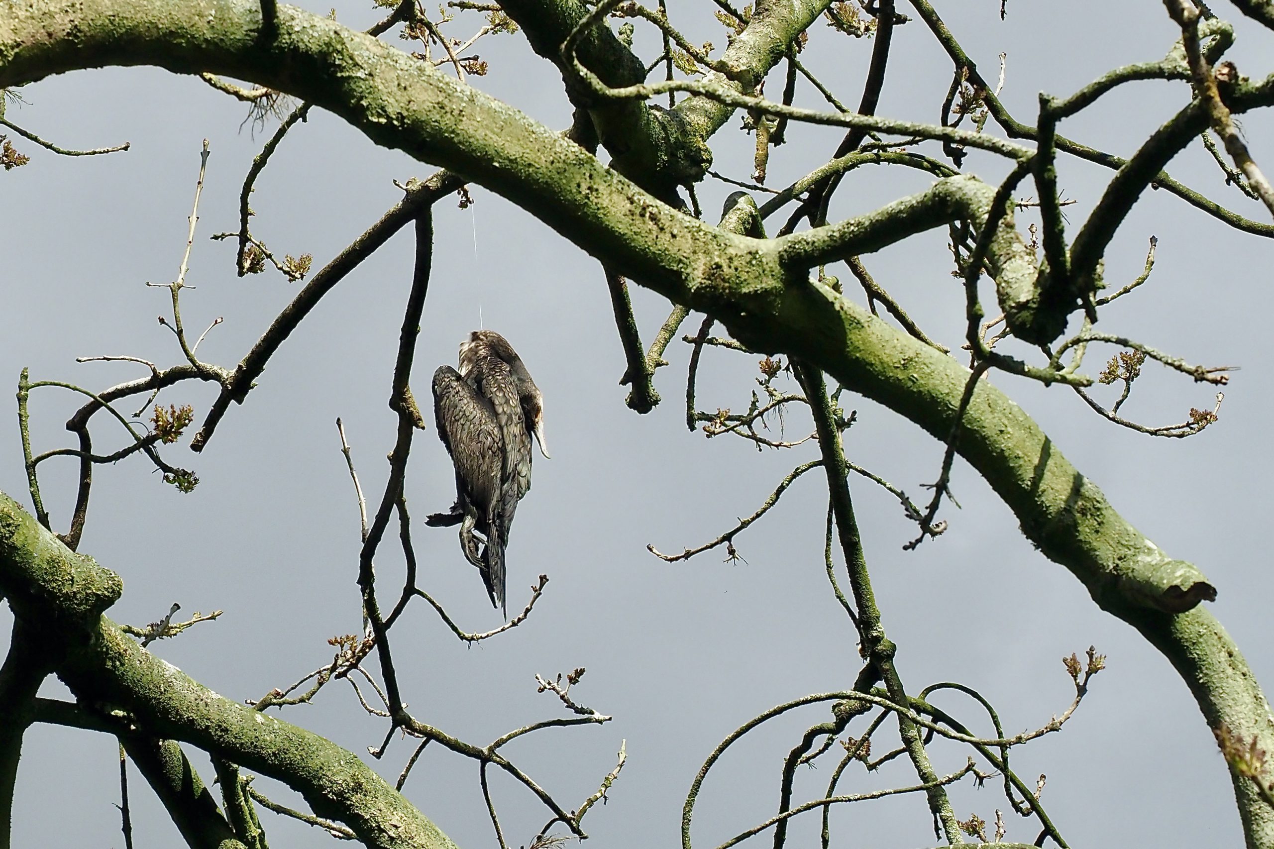 Van grote afstand al te zien, deze bungelende aalscholver. Door een ongelukkige samenloop verhangen in een boom aan de rand van de plas van de eendenkooi Klein Profijt nabij Rhoon.