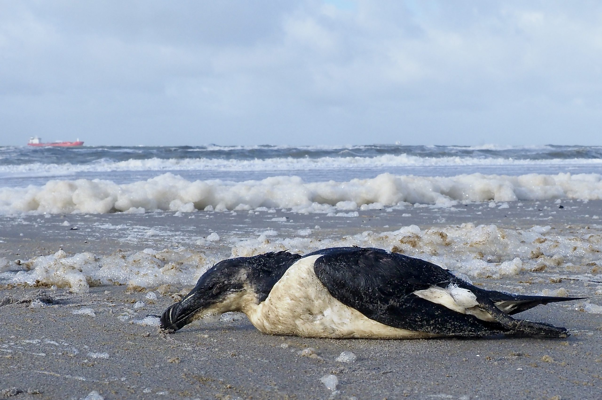 Meer kans heb je om een dode te treffen aangespoeld op het strand. Zoals deze, nog vers uit de zee. Met het oog nog halfopen in de branding. Slachtoffer van de storm of vogelgriep of beide? Of gewoon gestorven van ouderdom? Het laat zich raden. Maar de gedachte aan een pinguïn kwam weer boven, vanmiddag op het strand van de Maasvlakte.