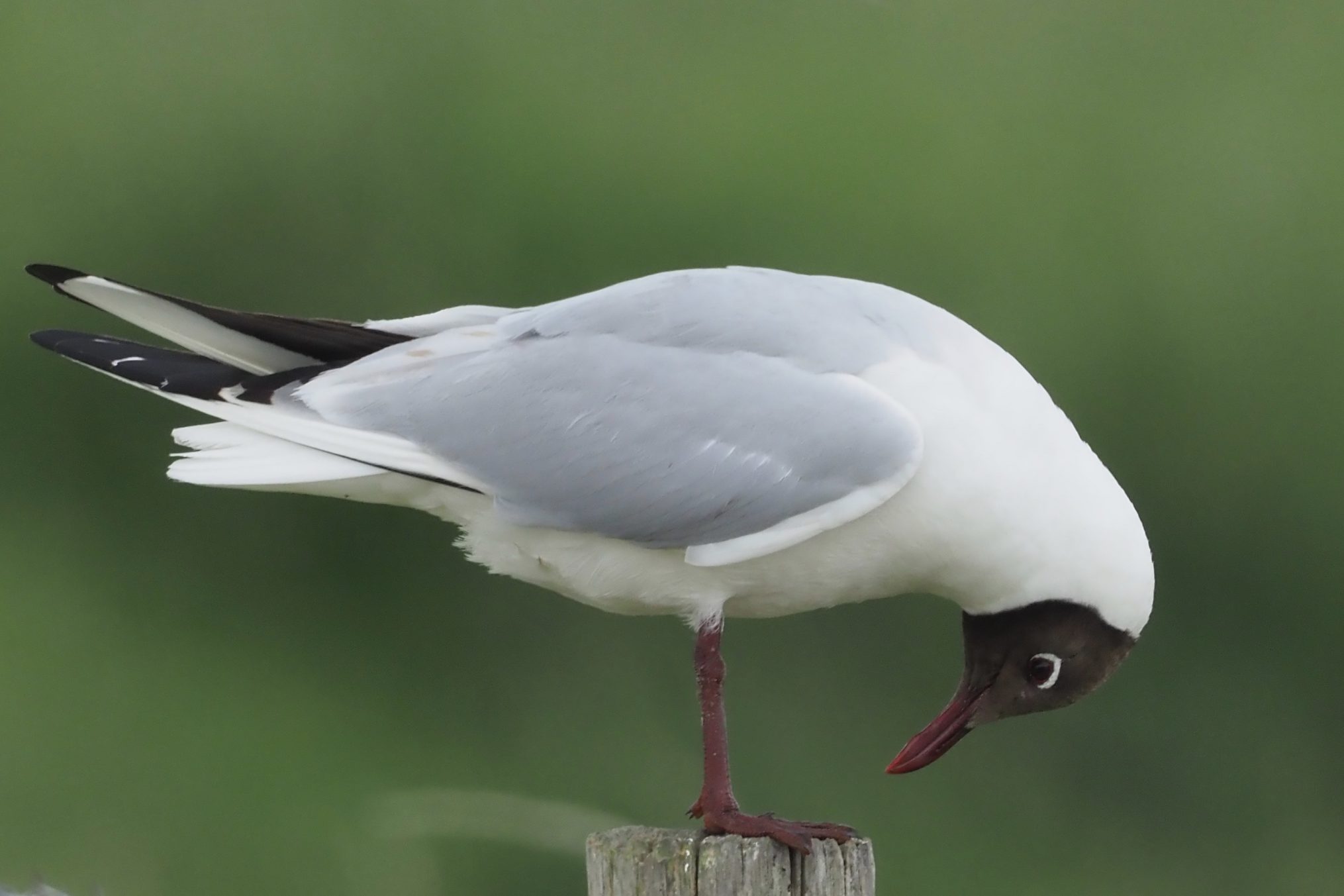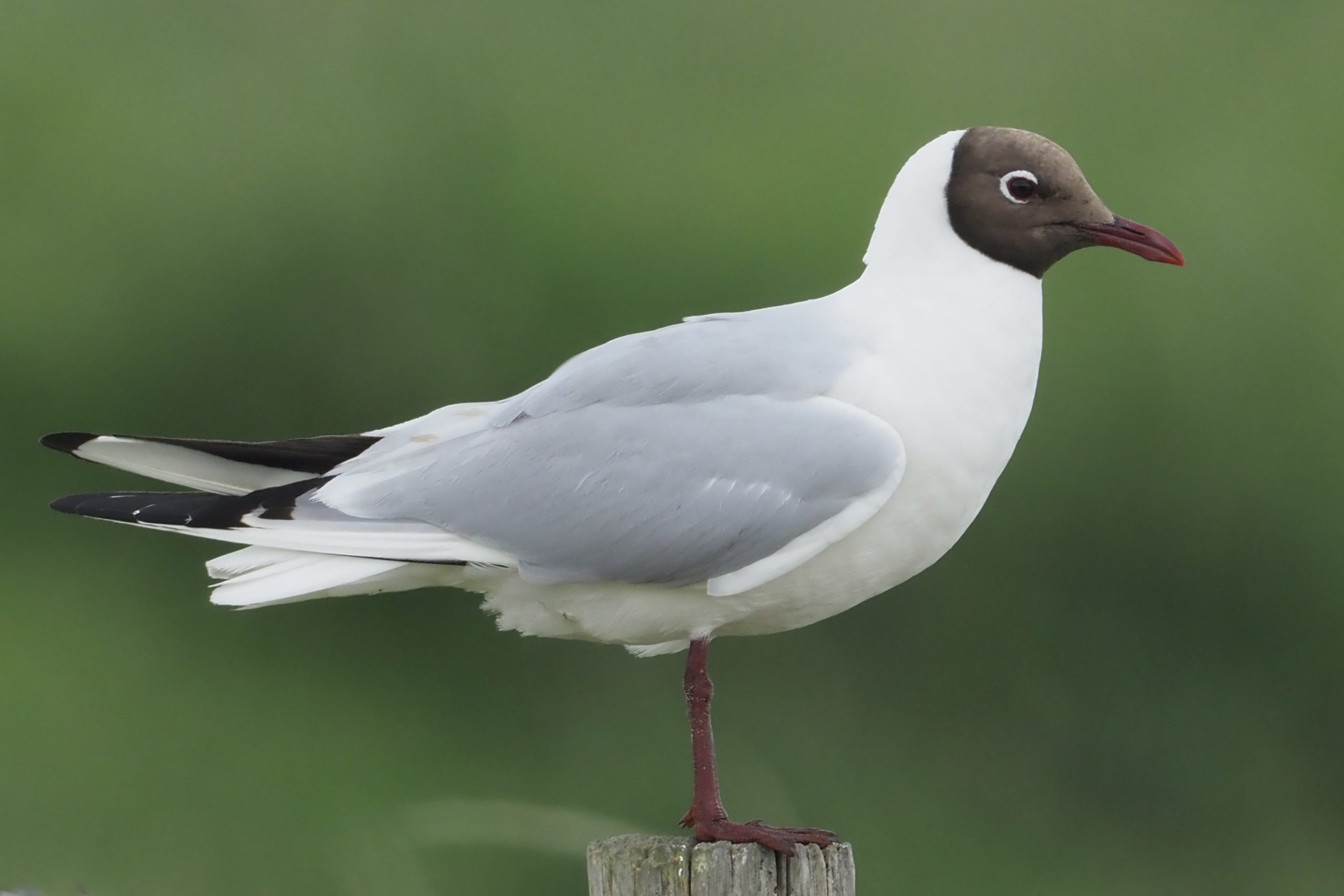 Volwassen kokmeeuw in zomerkleed staand op een paaltje. Een klassieke houding zoals die vaak ook terug te vinden is in oude vogelboekjes. Een ideale pose voor een afbeelding waarin je belangrijke veldkenmerken wilt laten zien zoals het kleurenpatroon, maar ook vleugellengte ten opzichte van de staart. Wel of geen oogring, vorm en kleur van de snavel enz. Deze vorm van presenteren is misschien wat stijfjes maar kan wel erg verhelderend werken en ik heb het altijd gewaardeerd. Oude vogelgidsen zijn dan ook leuk om op een rommelmarkt op de kop te tikken. Ook nieuwe gidsen bedienen zich nog steeds van deze plaatjes, maar vullen deze aan met beelden van vliegende vogels en dat is een verrijking. Ze zitten tenslotte lang niet altijd stilletjes te wachten totdat jij de juiste pagina hebt gevonden om ze te determineren. Deze kokmeeuw werkte echter volledig mee, gaf me alle tijd de boekjes er bij open te trekken. Maar ik had het voor de determinatie niet echt nodig. Goed te zien is dat de kop chocoladebruin en niet zwart is. Op afstand kan de indruk anders zijn. Ook de niet volledig gesloten oogring wordt niet altijd zo herkend.