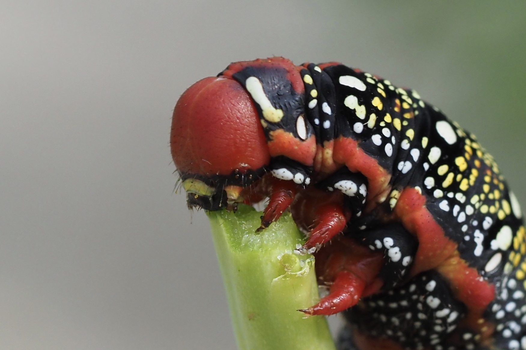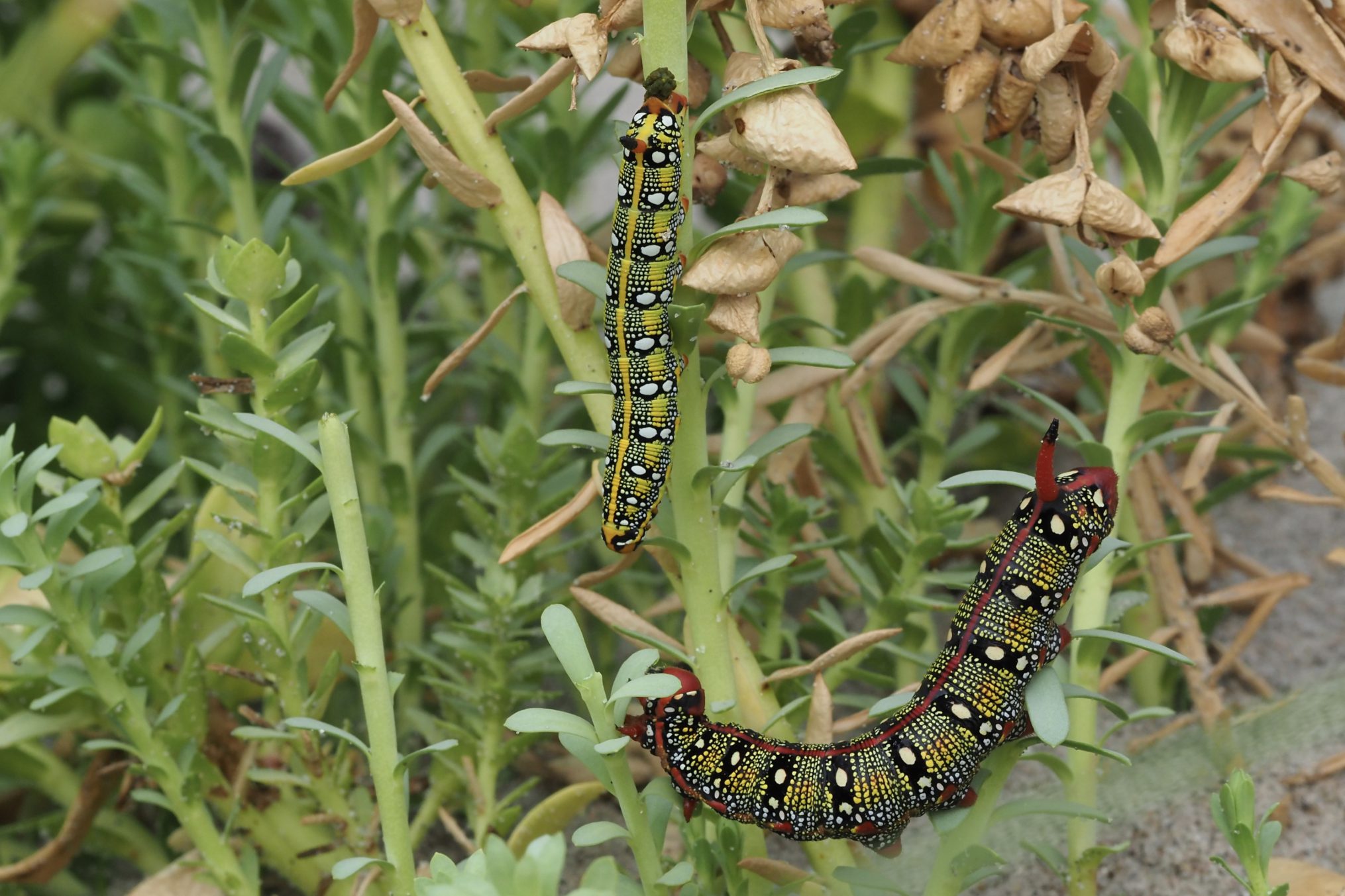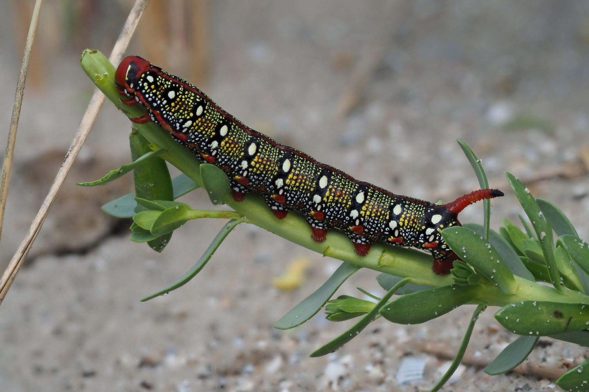 Vanmiddag op de slikken van Voorne liep ik Inge Moree tegen het lijf, natuurliefhebber en bekende van het IVN, die mij enthousiast vertelde dat ze zojuist een aantal Wolfsmelkpijlstaartrupsen had aangetroffen. Landelijk zeer zeldzaam en in deze regio vnl te vinden op Goeree, op de Kwade Hoek. Hier had ik ze nog nooit aangetroffen. Op een struikje zaten er drie, twee volgroeid met de rode streep op de rug en een donker patroon en een derde exemplaar nog in de groene fase. Reden genoeg om thuis mijn camera met macrolens te halen. Het struikje gemarkeerd met een plastic fles (zwerfafval heeft ook zijn voordelen) zodat het makkelijk terug te vinden was en bijgaande plaatjes geschoten. De rupsen vreten de plant met stengel en al. Het schijnt dat in sommige landen de rups is uitgezet om de wolfsmelkplant eronder te houden. En eten kan hij! Onder de stengel die gesloopt werd lagen diverse uitwerpselen, het is tenslotte vezelrijk voedsel. Nog even wachten en dan verdwijnen ze onder het zand om te verpoppen en volgend jaar als vlinder verder te gaan.