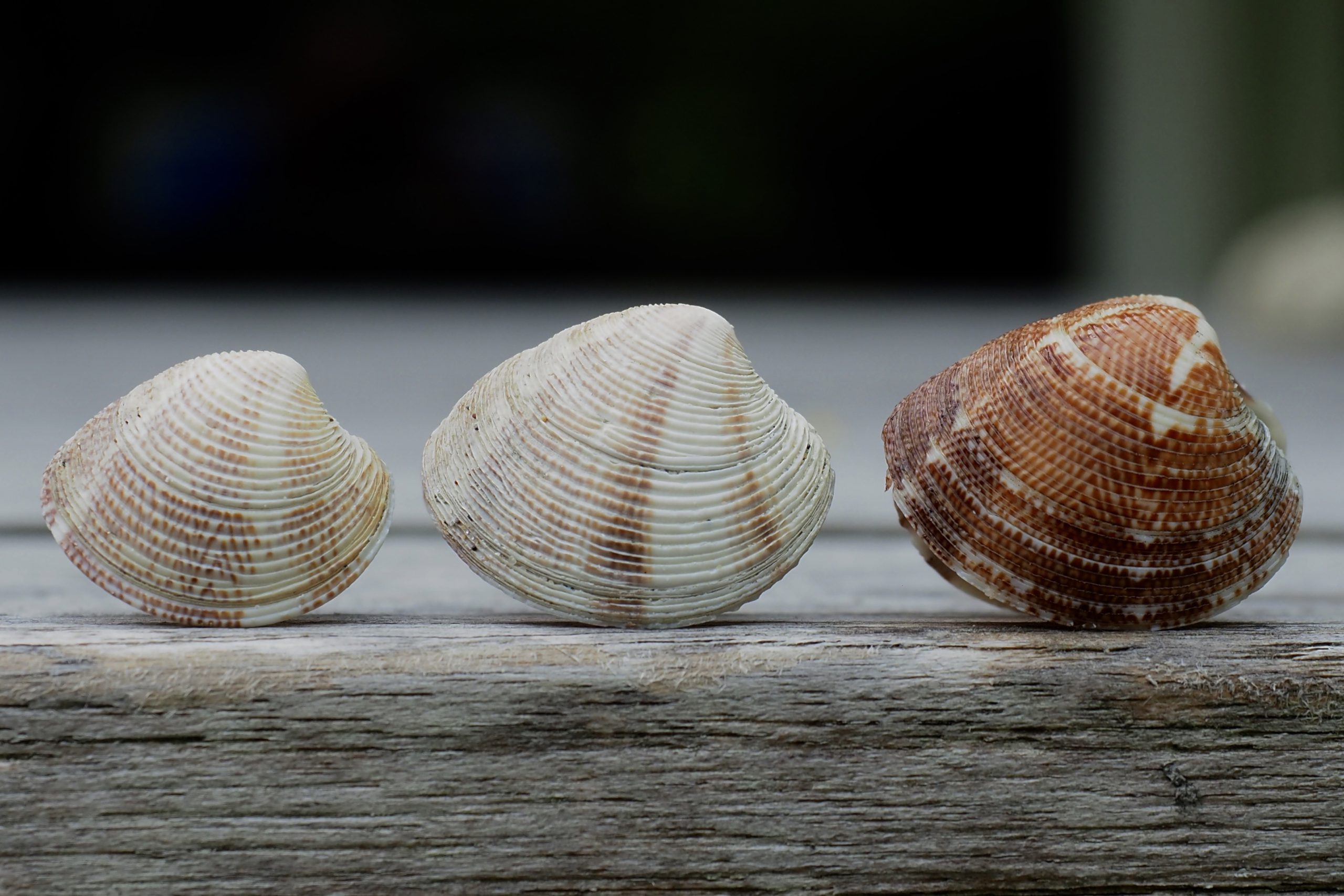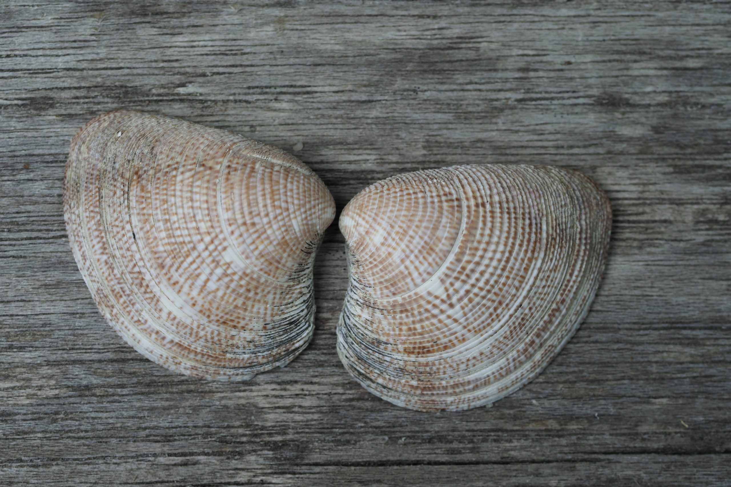 Een gewone schelp, de Venusschelp. Algemeen langs de kust, leeft diep in zee, ingegraven in het zand. Met name met oostenwind kan je hem veel op het strand aantreffen. Blijkbaar wordt dan de bodem weer eens opgeschut, komen ze “vrij” en spoelen aan. Op dit moment wordt er voor de kust van de Maasvlakte zand opgezogen en is de turbulentie maximaal. Er zijn dan nu ook veel doubletten van de Venusschelp te vinden. En als je er dan thuis drie op een rij op de tafel te drogen zet vallen de vorm en het mooie patroon op. Gewoon en toch bijzonder.