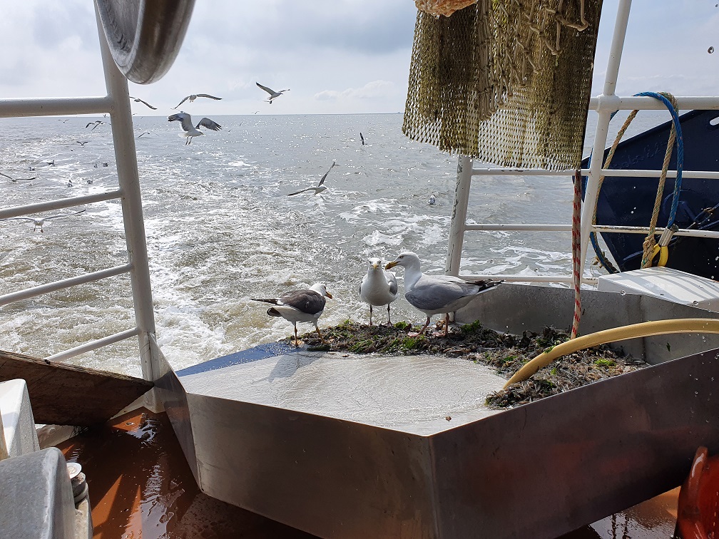 Ook enkele meeuwen vonden de opbrengst aantrekkelijk genoeg om brutaal te komen snoepen.