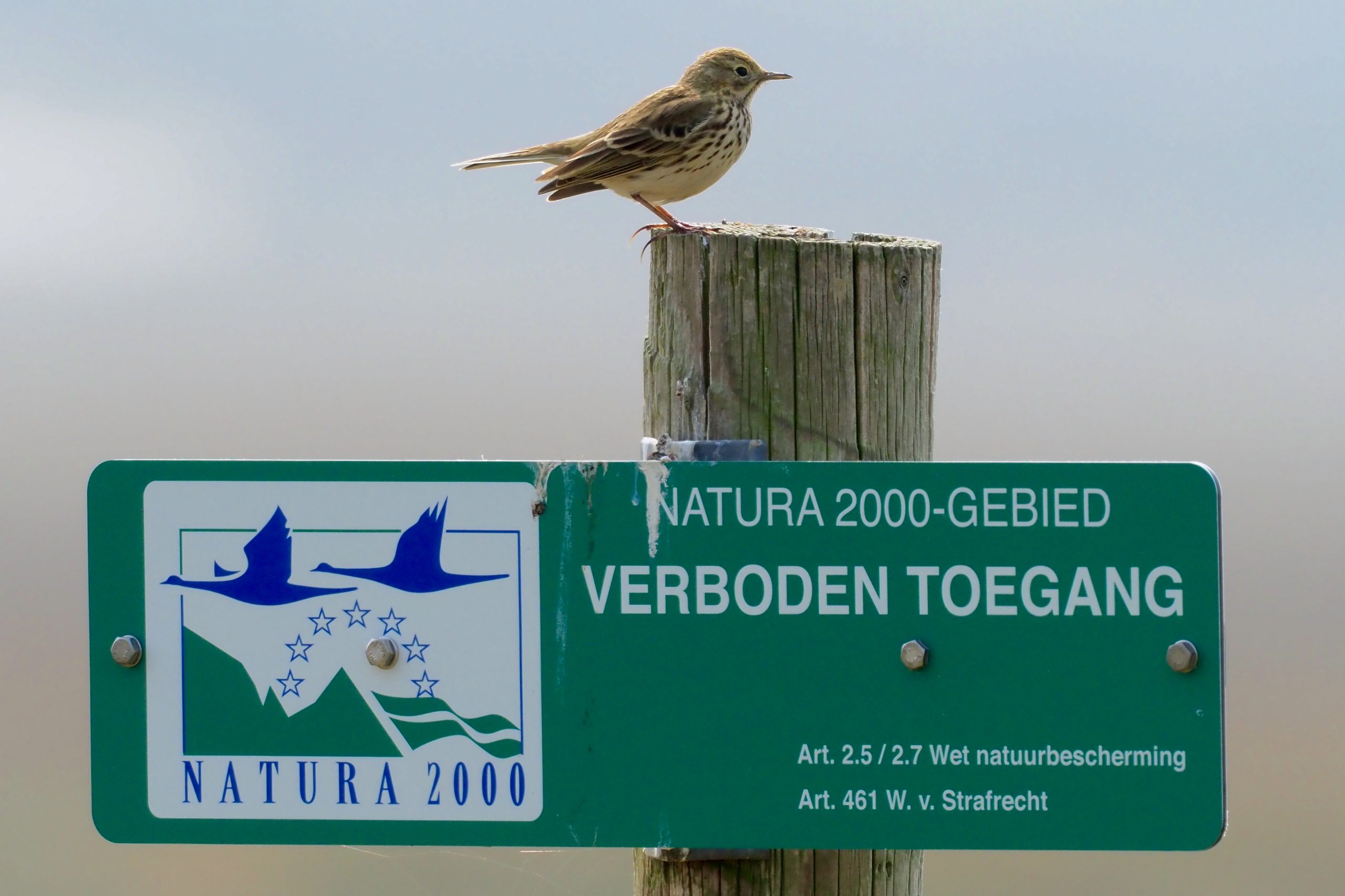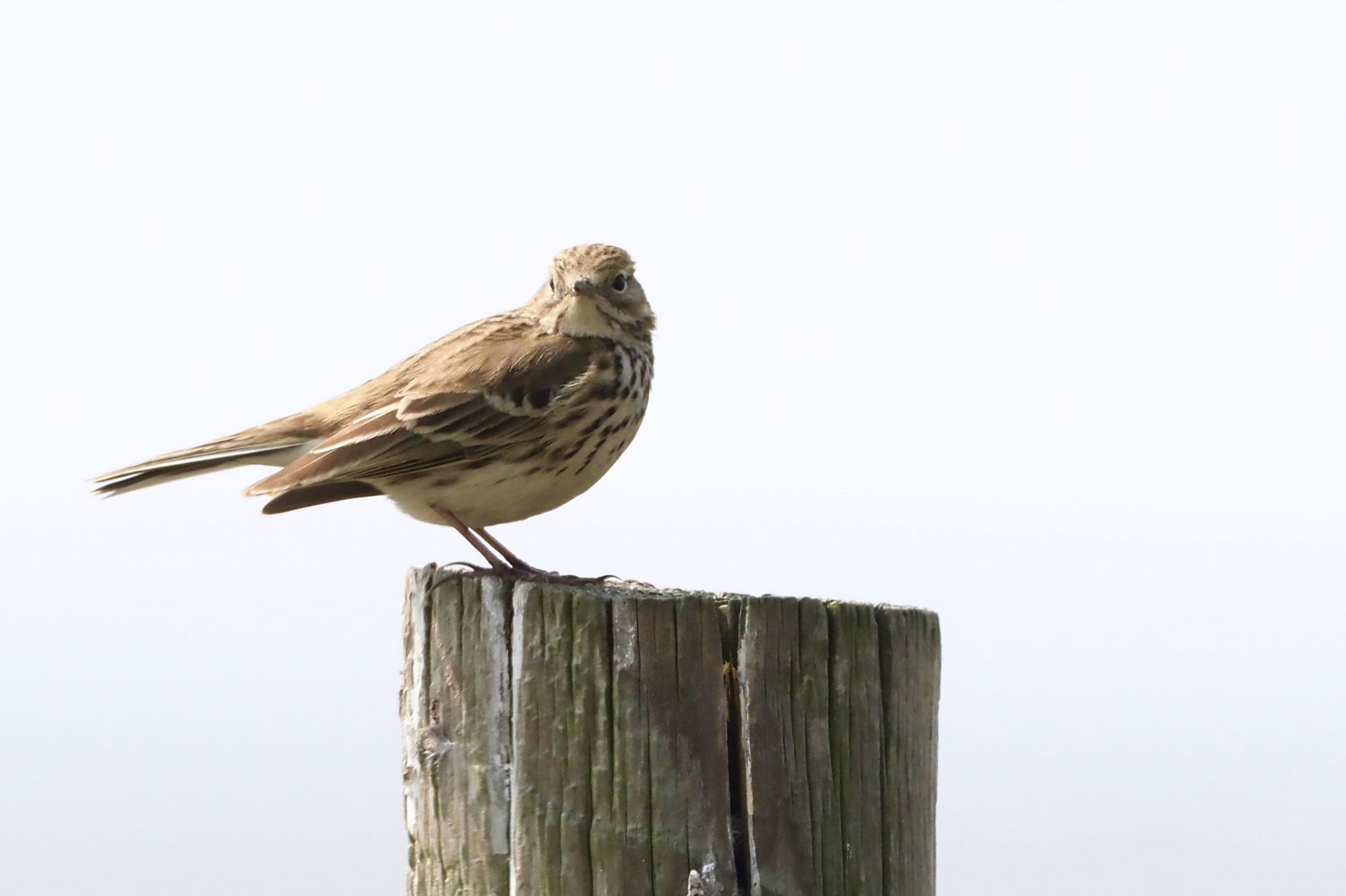 Een graspieper zit op de uitkijk op de grens van het wandelpad en het beschermde deel van de Slikken van Voorne. In deze oksel tussen de Maasvlakte en het strand van Voorne, tegen de Brielse Gatdam aan, is een rijk natuurgebied ontstaan. Door de beschutting van de Maasvlakte blijft het slib hier hangen en ontstaat steeds meer ruimte voor de vorming van slikken. Nog steeds komt het water tot dichtbij de duintjes van de Brielse Gatdam, bij stormvloed er zelfs tegen aan.