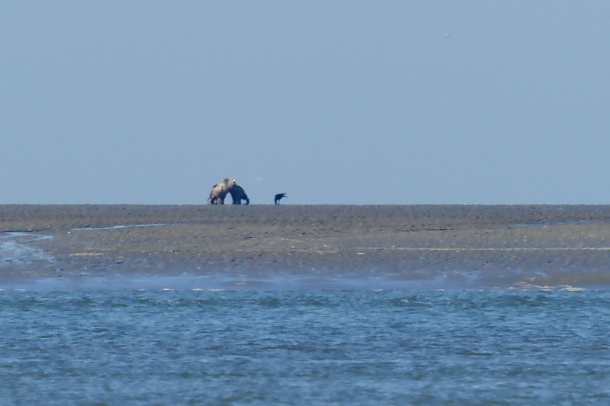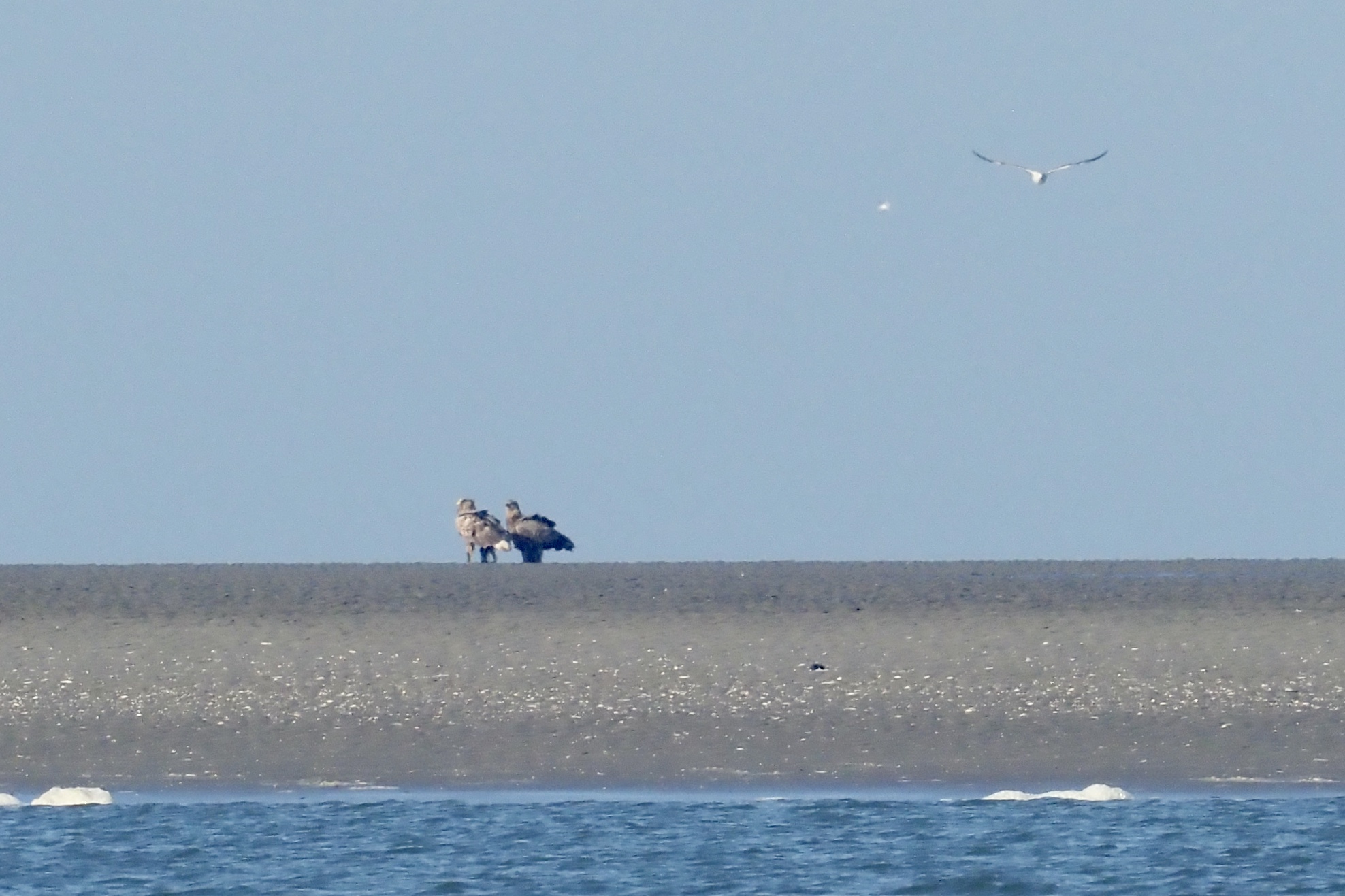 Bij het aftasten van de plaat met onze kijkers zagen we een reusachtige vogel zitten die even later gezelschap kreeg van een tweede die vanachter de luwte aan de westkant naar het hogere deel van de plaat was gelopen en zich bij zijn soortgenoot had gevoegd. Houding en vorm maakten het ondanks de grote afstand duidelijk: twee zeearenden! Alsof het bedoeld was om hun majestueuze grootte te benadrukken streek vlak bij hen een kraai neer. Iedere twijfel was nu weggenomen.