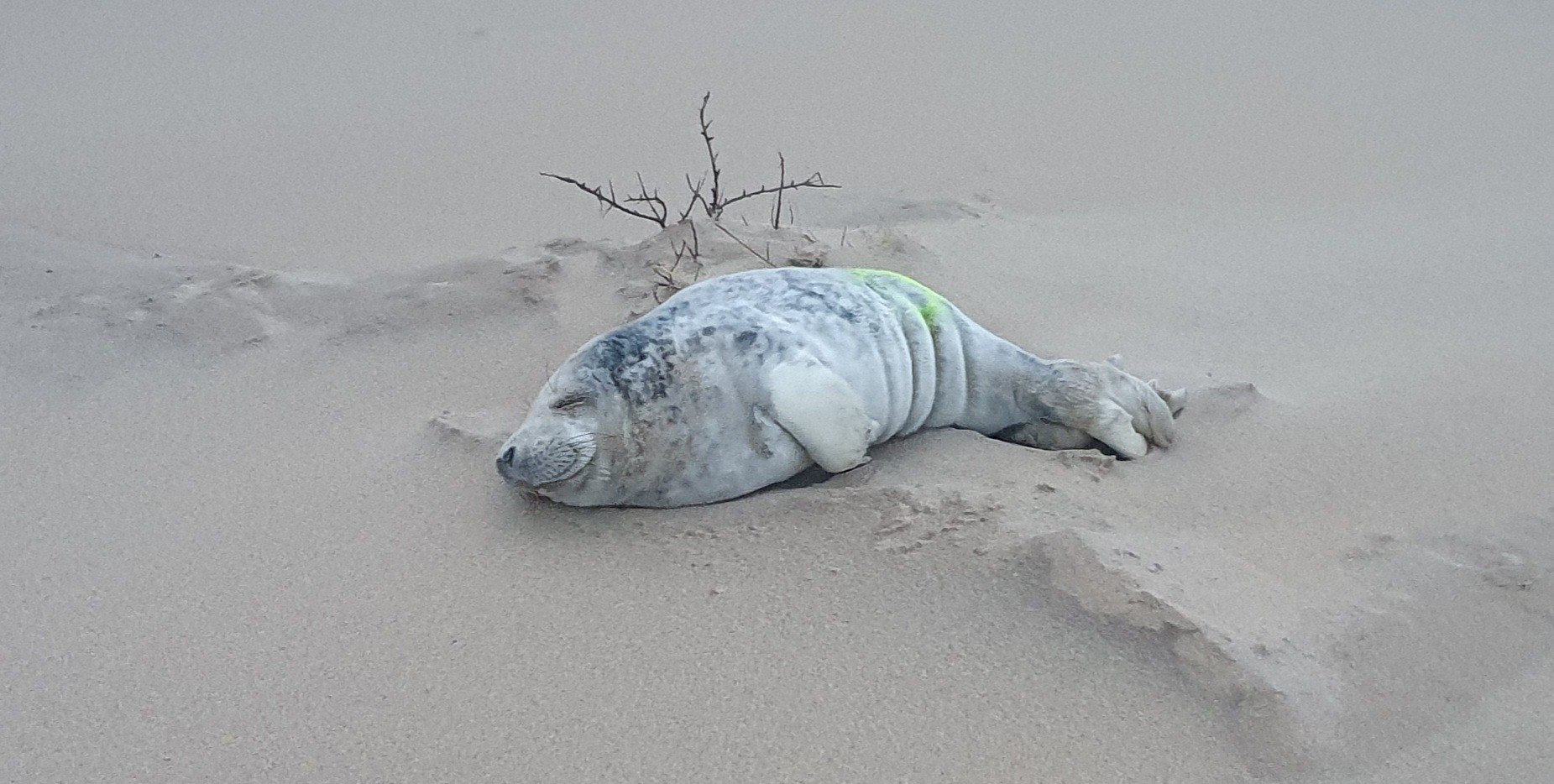 Deze, net verhaarde pup kwam het strand op bobberen en vond een plekje uit de harde wind.