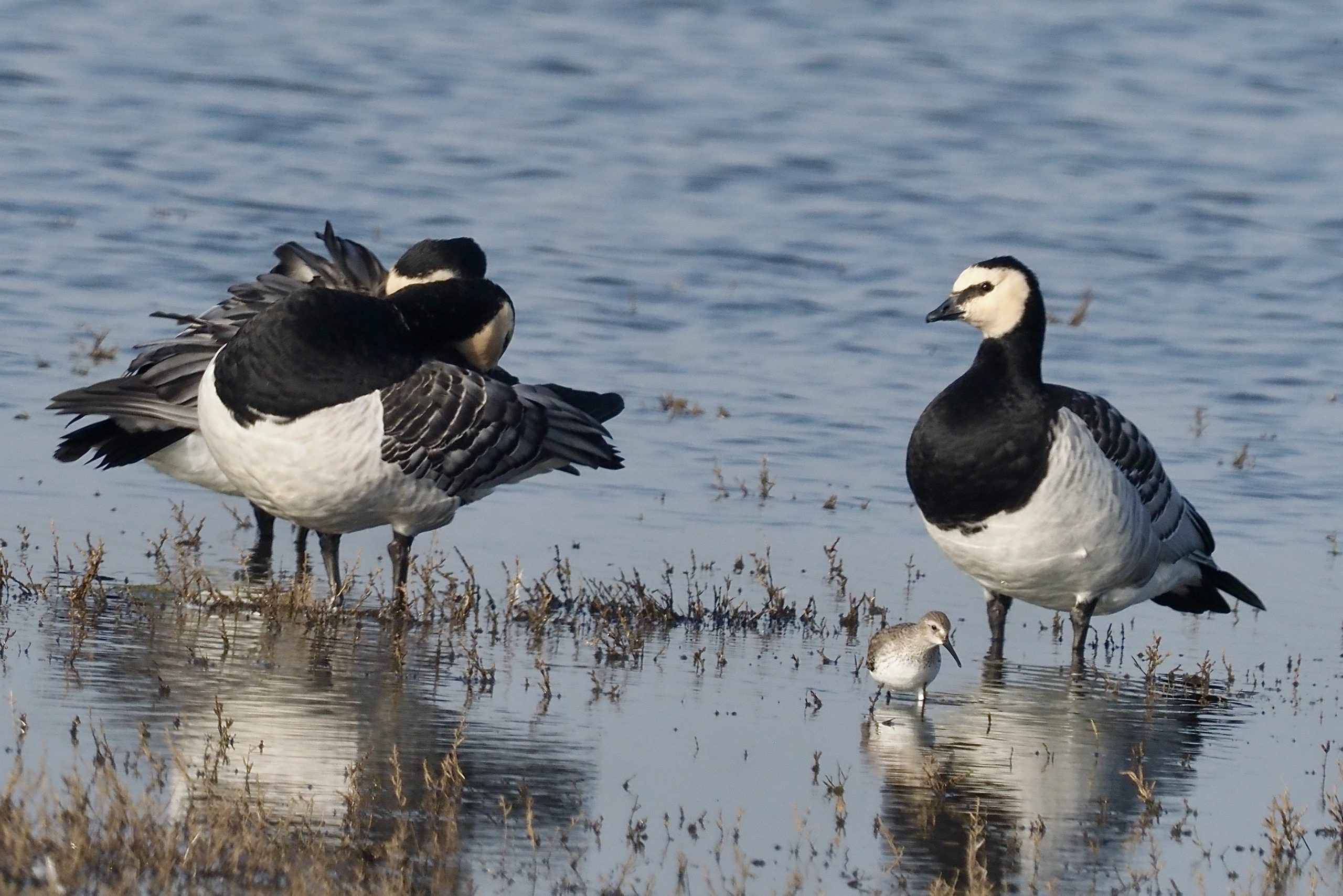 De Bonte strandloper op de voor grond valt in het niet bij de 3 Brandganzen , niet eens een grote ganzensoort. En de Bonte strandloper is ook niet een hele kleine vogel. Om er getallen aan te hangen: de laatste weegt zo’n 50 gram en de Brandgans 1,7 kilogram, 34 x zoveel. Een Canadese gans haalt overigens 5-6 kilo.