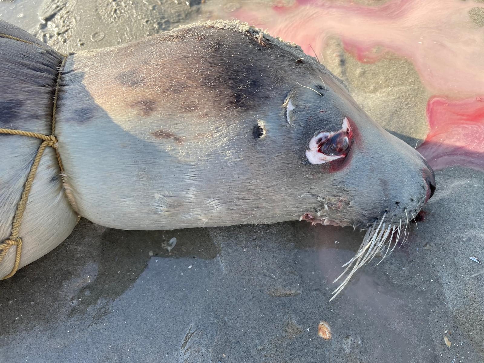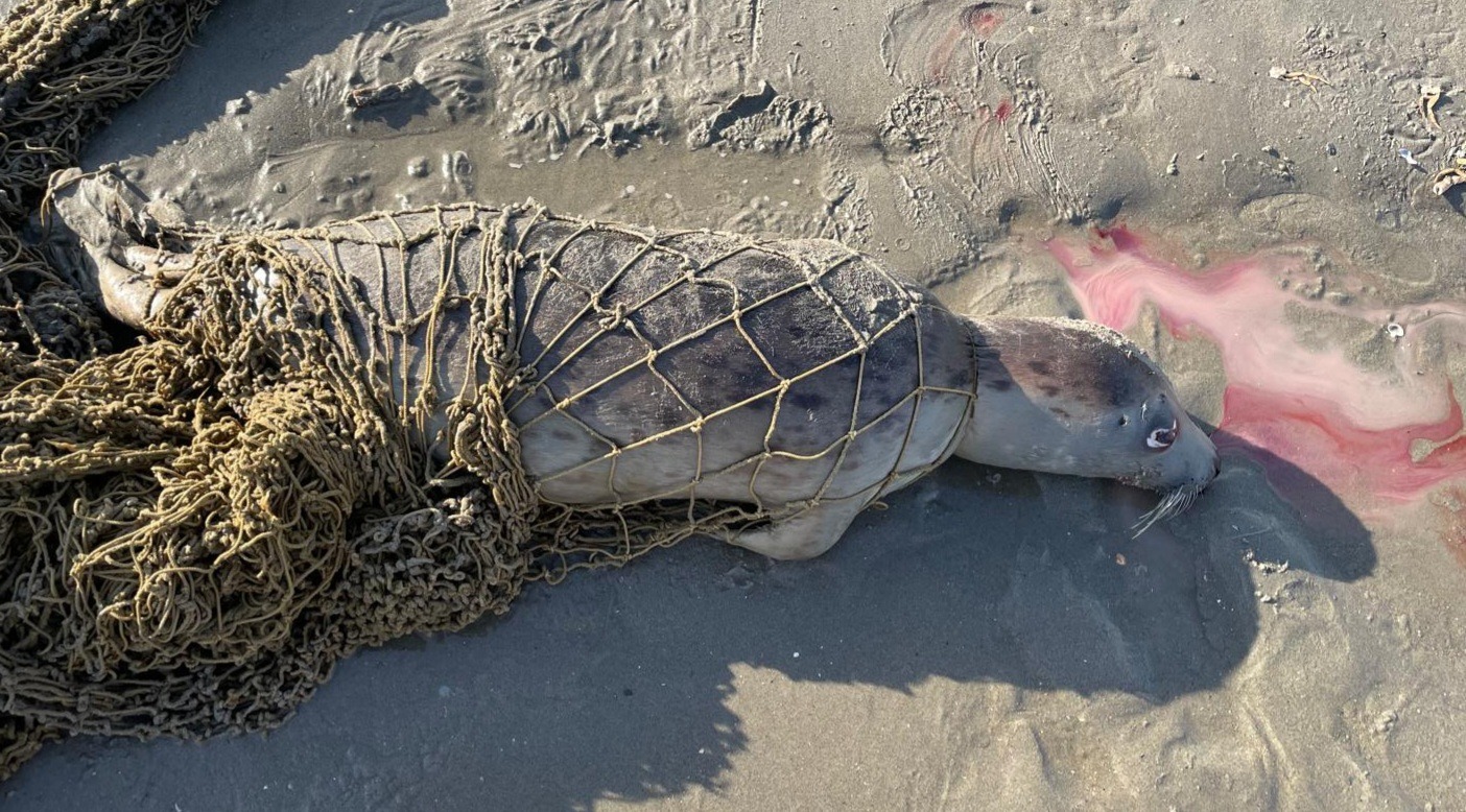 Een nog jonge grijze zeehond die gestikt was in een net.