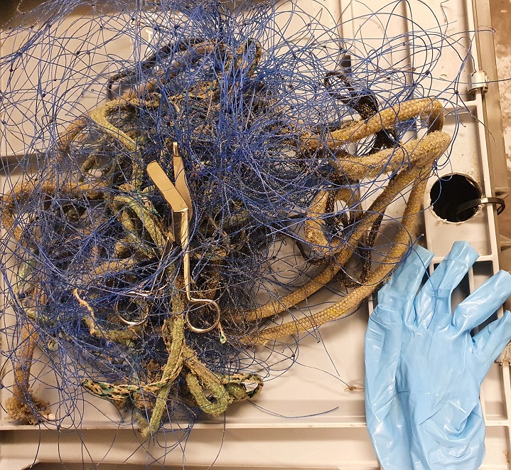 Doordat er een visnet strak om de nek en voorflappen zat, lukte dit maar moeizaam en het was duidelijk dat we snel moesten ingrijpen.