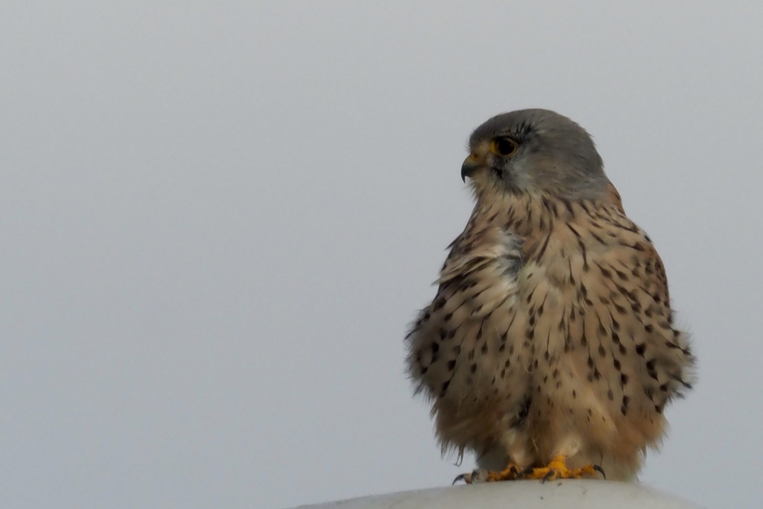 Het zonnetje liet zich deze zondag een paar uurtjes zien, maar om twee uur was het wel afgelopen. De grauwe wolken namen de overhand en de wind wakkerde aan. Op de verlaten Oosterschelde dijk nabij de Plompe Toren zat een torenvalk op een lantarenpaal om zich heen te kijken. De opgestoken wind waaide door zijn verenkleed.