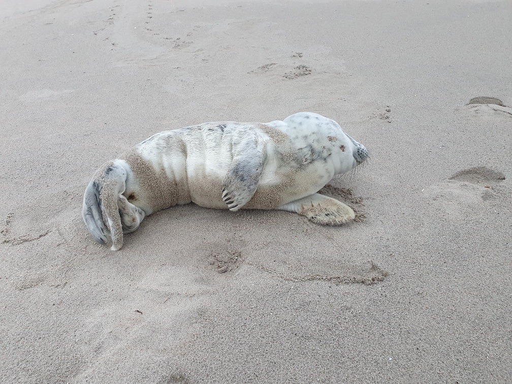 Deze pup van de grijze zeehond lag onderaan een strandovergang.