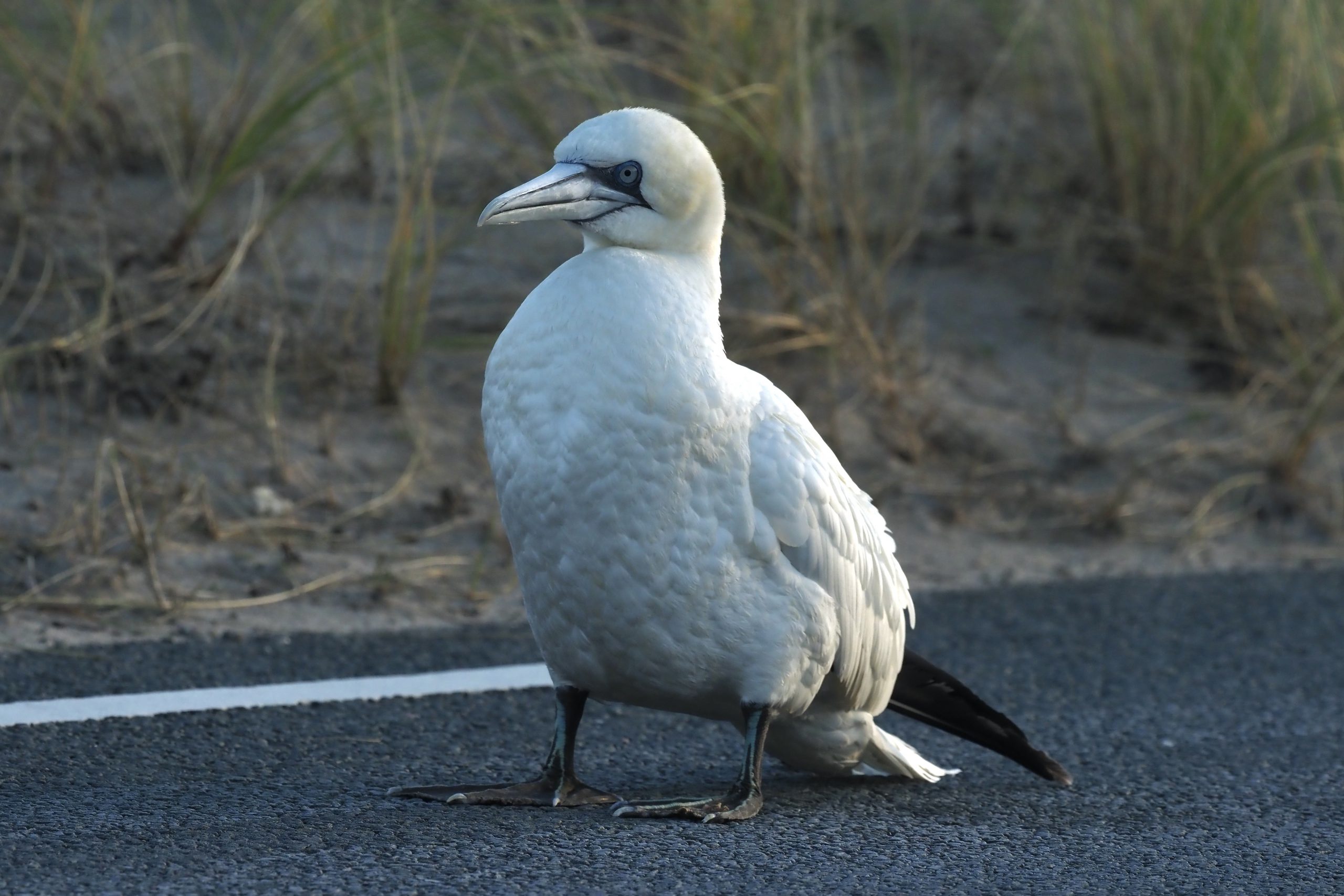 Na een paar uurtjes met nauwelijks een vermeldenswaardige jachtbuit de terugtocht aanvaard en van de Maasmond onder de duinen langs terug gereden naar Oostvoorne. Voor lokaal bekenden: de Prinses Maxima weg. Ter hoogte van paal 13.8 zag ik voor mij een grote witte vogel op de weg zitten. Een Zilvermeeuw dacht ik. Ze zijn niet schuw en vliegen niet snel op als er wat te snaaien valt. Maar bij het passeren moest ik mijn gedachten bijstellen. Het was iets dat je niet op het land verwacht. Een volwassen Jan-van-Gent.