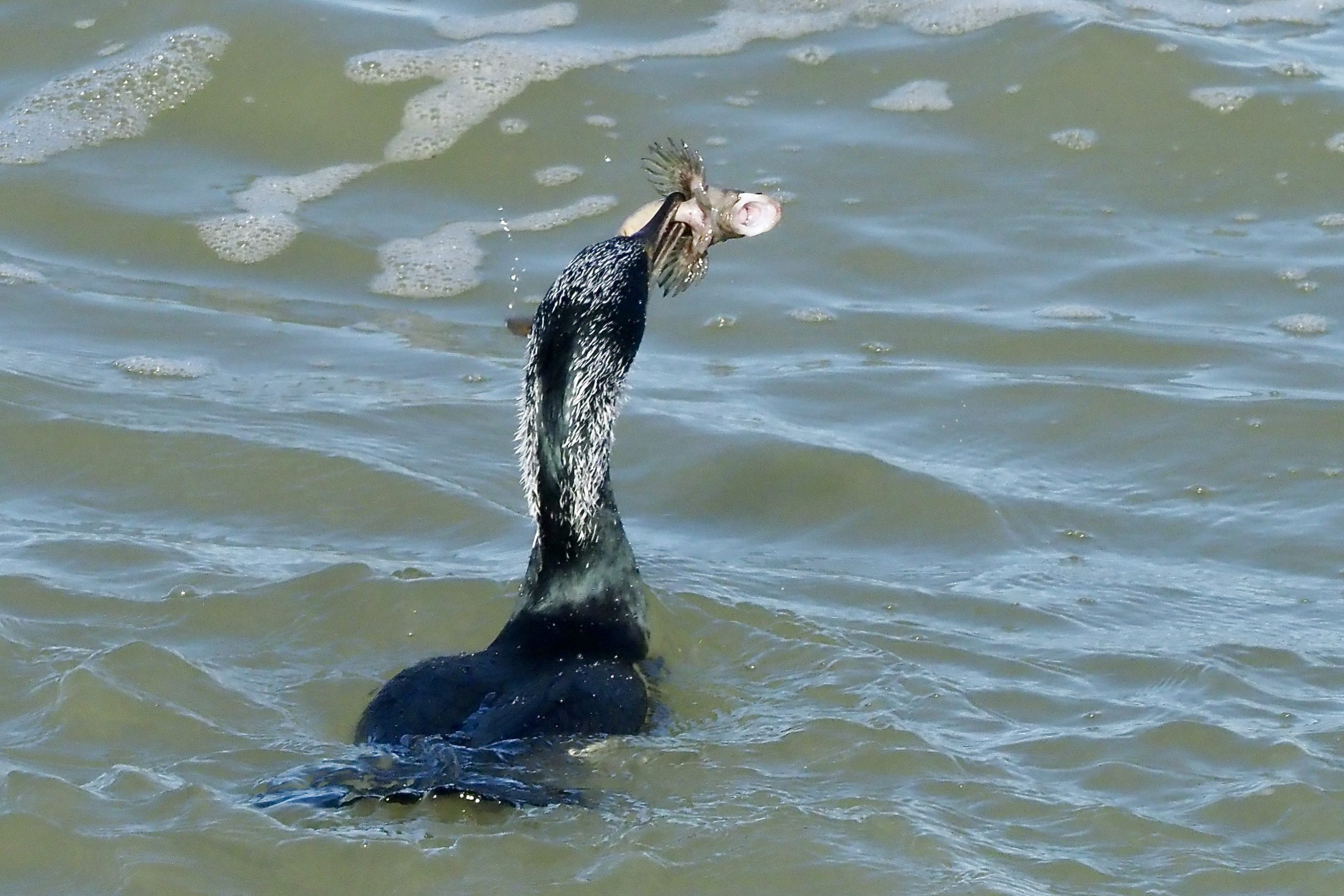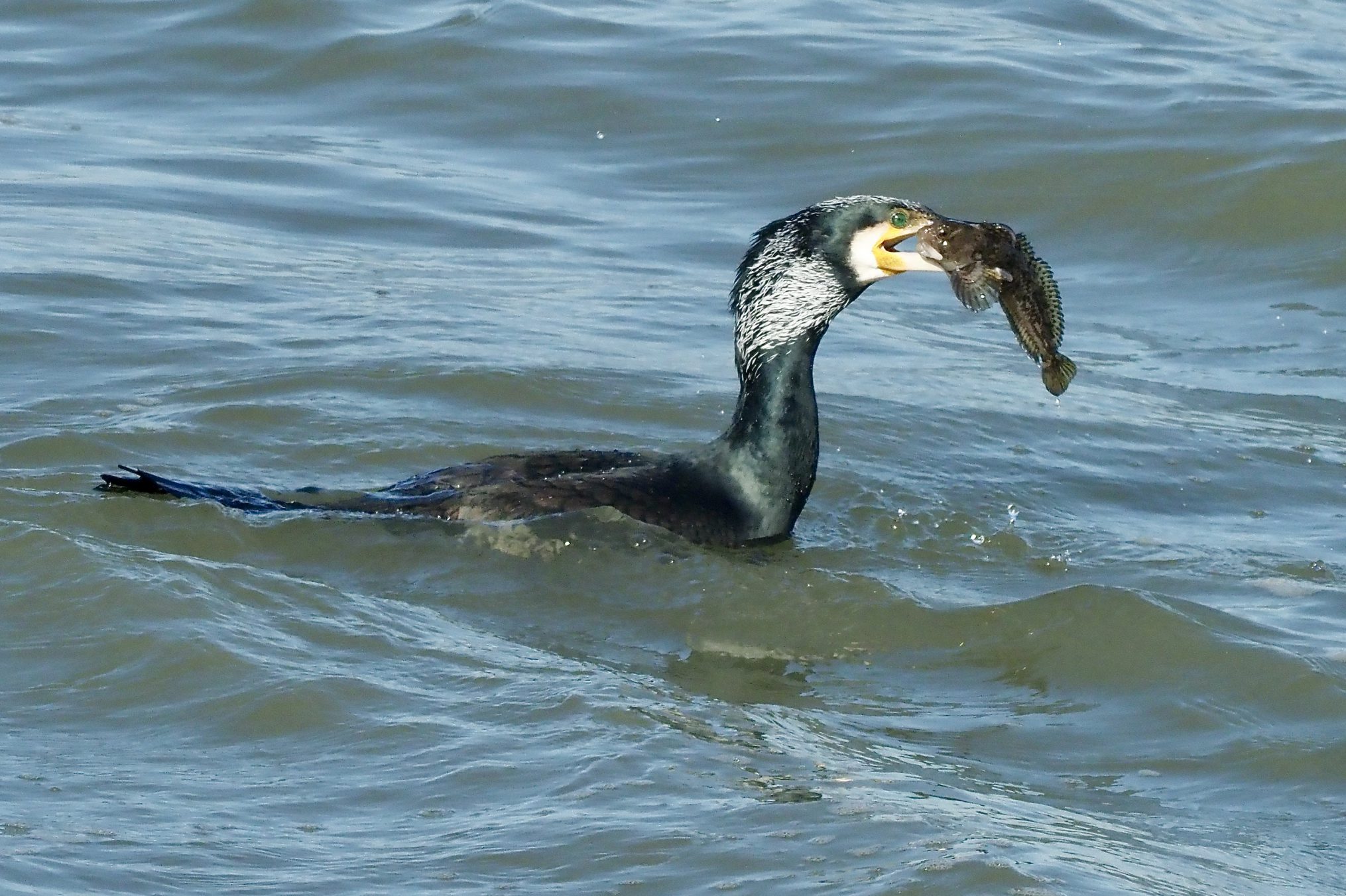 Na een paar sprongetjes was het raak: onder aan de blokkendam van de Maasmond werd een duik beloond met onze eerste levende Gewone Slijmvis. Keurig voor de foto in een onaangename pose. De bijna volledig in prachtkleed uitgedoste Aalscholver deed wat we van hem hadden kunnen verwachten: hij at het visje op. Geen sportvisser die zijn trofee netjes teruggezet.