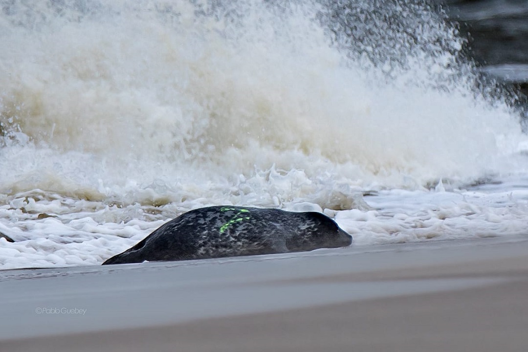 Ook zondag lag het dier opnieuw op het slufterstrand te rusten en hebben we de kegelrob een tijdje in de gaten gehouden.