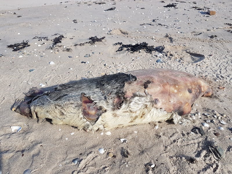 Een pup gewone zeehond, in verre staat van ontbinding, zonder kop.