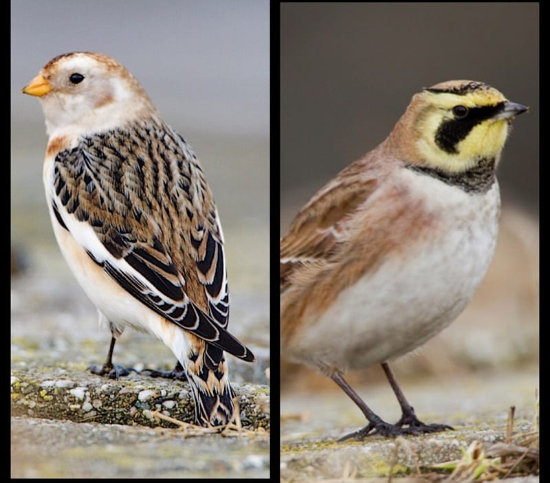 Strandleeuweriken (rechts) vallen op door het  zwart/gele contrast op hun kop.