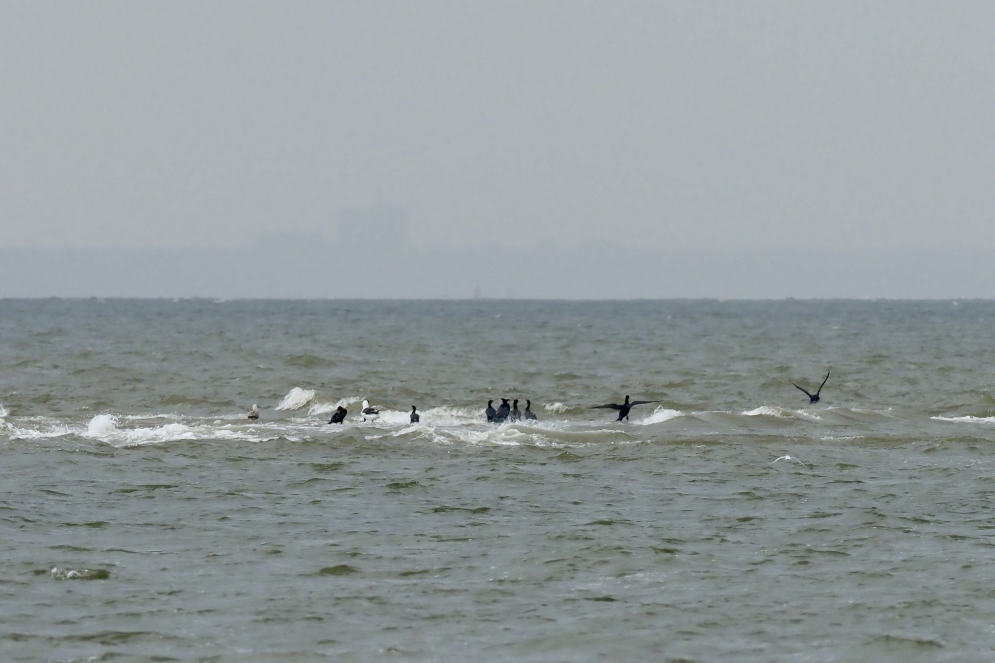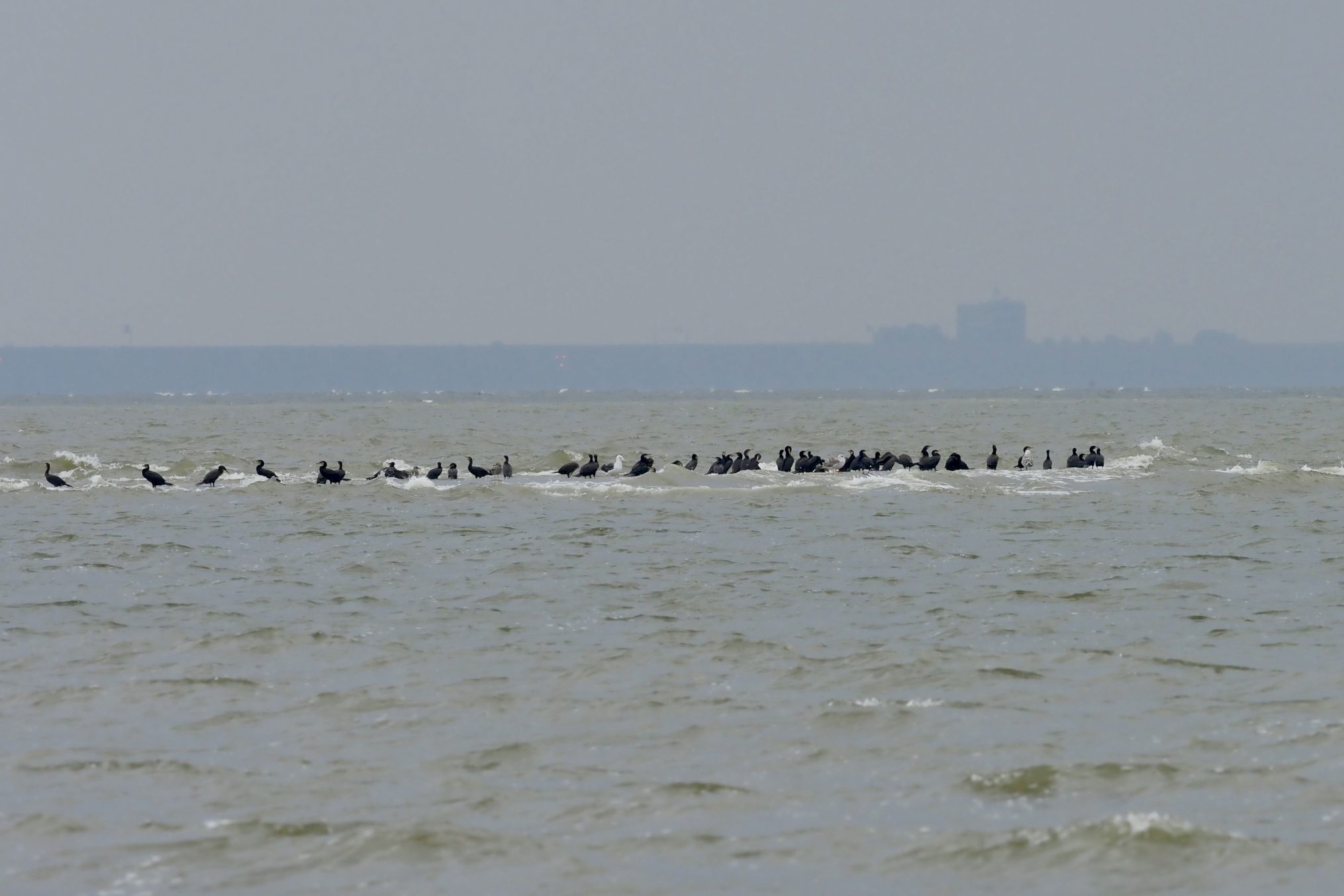 Deze week observeerde ik een grote groep aalscholvers vergezeld van een enkele meeuw op een plaatje voor het strand van de Maasvlakte. Zo’n 120 exemplaren hadden zich daar op een bewolkte dag verzameld en zaten gezellig omringd door het grauwe knobbelige water. Nu de jongen uitgevlogen zijn en het voeren voorbij is , is er weer meer tijd om met elkaar in groepen rond te hangen. Eens kijken hoe ze zouden reageren op het stijgende water dat naar verwachting binnen een uur het bankje zou gaan verzwelgen.
