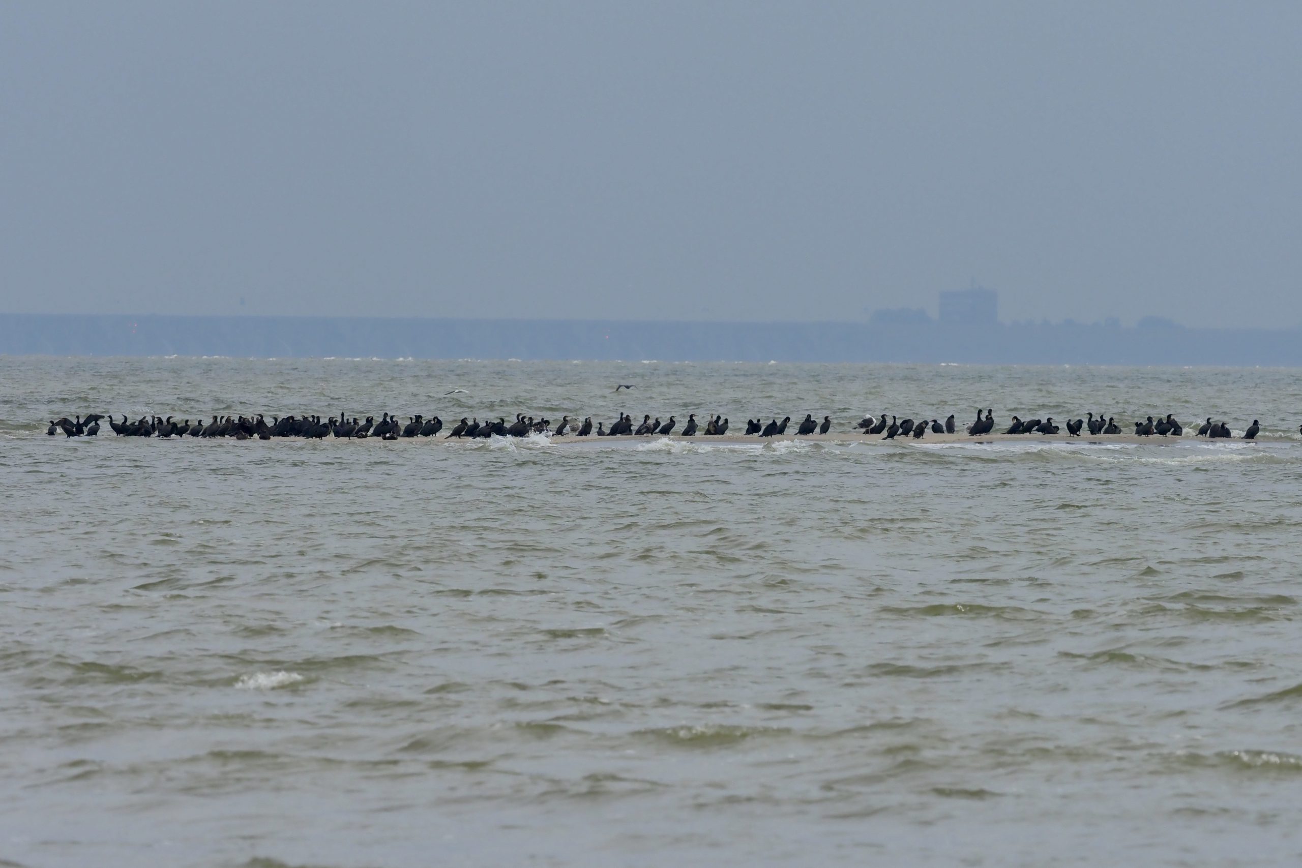 Deze week observeerde ik een grote groep aalscholvers vergezeld van een enkele meeuw op een plaatje voor het strand van de Maasvlakte. Zo’n 120 exemplaren hadden zich daar op een bewolkte dag verzameld en zaten gezellig omringd door het grauwe knobbelige water. Nu de jongen uitgevlogen zijn en het voeren voorbij is , is er weer meer tijd om met elkaar in groepen rond te hangen. Eens kijken hoe ze zouden reageren op het stijgende water dat naar verwachting binnen een uur het bankje zou gaan verzwelgen.