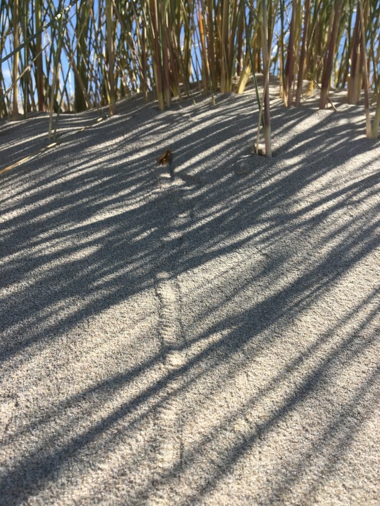 Nieuwsgierig volgden we het lange, smalle spoor in het zand richting het helmgras. Daar zagen we de strandganger… met heel veel moeite kroop er een rups door het zand. 1 Stap vooruit en weer 3 naar achteren, want ook met zoveel pootjes valt dat toch echt niet mee in het mulle zand.