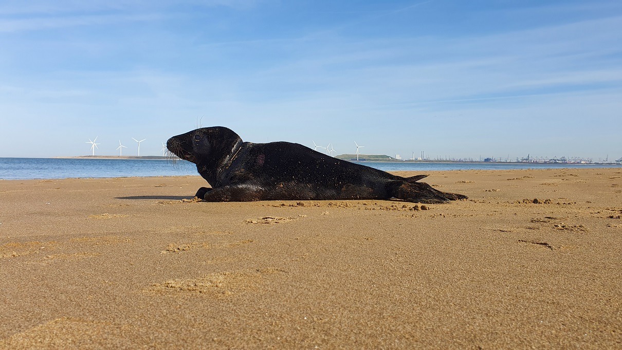 Opvallend was de gitzwarte kleur van de vacht van deze jonge kegelrob.