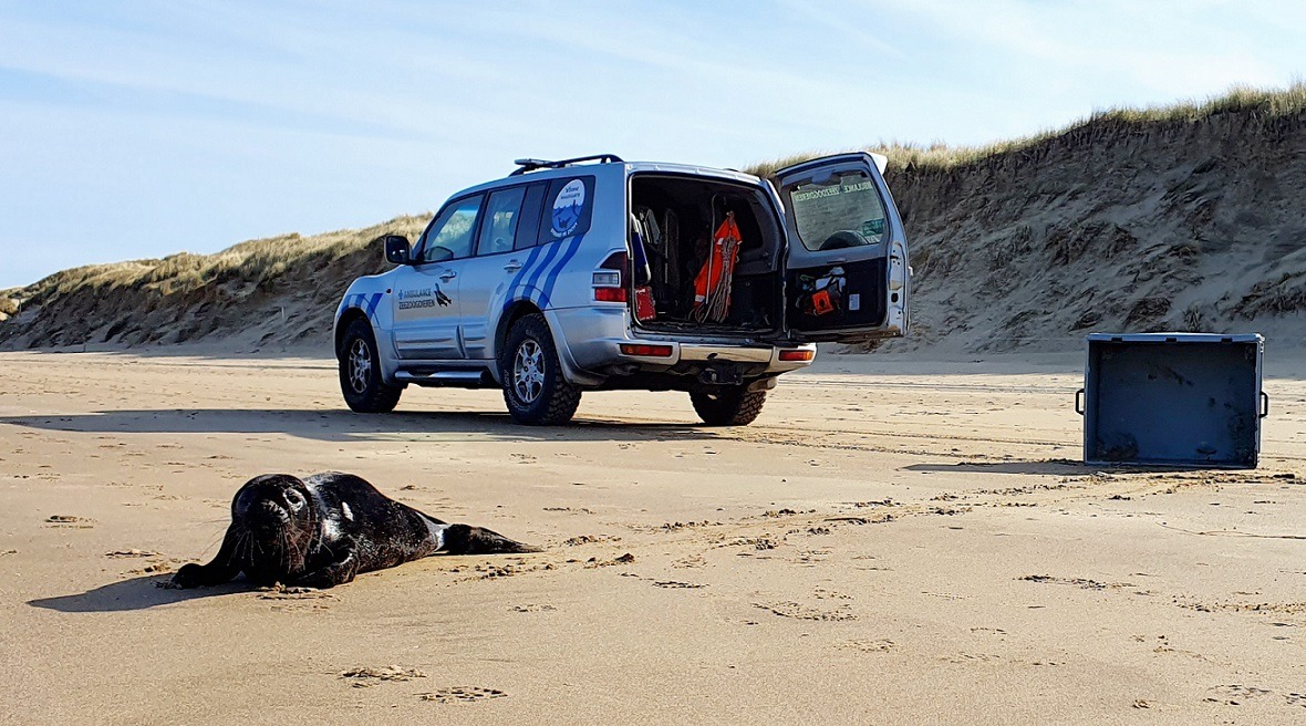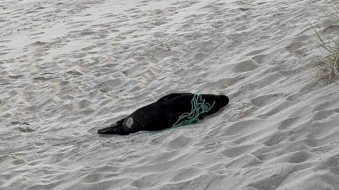 “Er ligt een zeehondje tegen de duinen met een stuk net om de hals.”