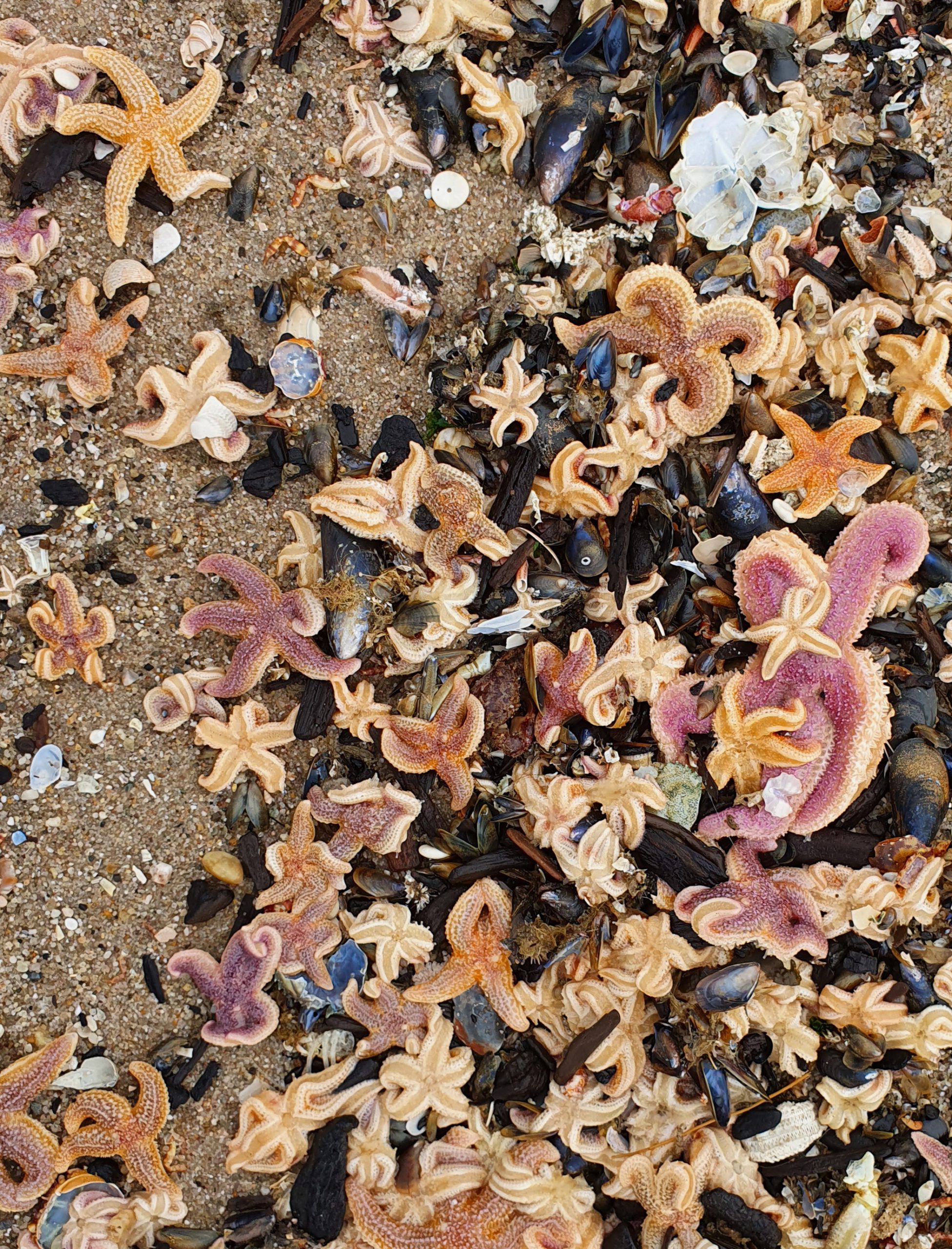 Een lange strook met aangespoelde zeesterren, schelpen, krabben en ander materiaal.