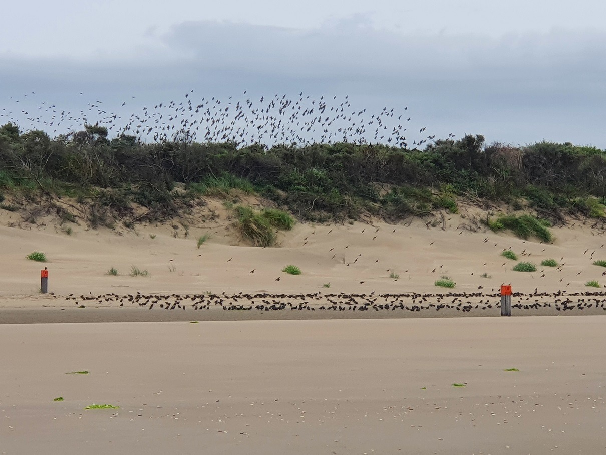 Vanmorgen bezochten duizenden luidruchtige spreeuwen het strand van Voorne aan Zee en de vloedlijn kleurde donker.